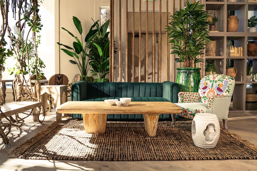 In its interior too, Los Angeles–based collaborators Schoos Design and Studio Mood have interpreted South Indian motifs completely differently than they did at Dosa. Whereas the previous restaurant was brightly painted and hung with sparkling statement chandeliers, at Copra they use natural materials and traditional crafts to transport guests to the motherland. Vines hang everywhere in the dining room, transforming it the way the jungle transforms the ruins of an ancient temple.