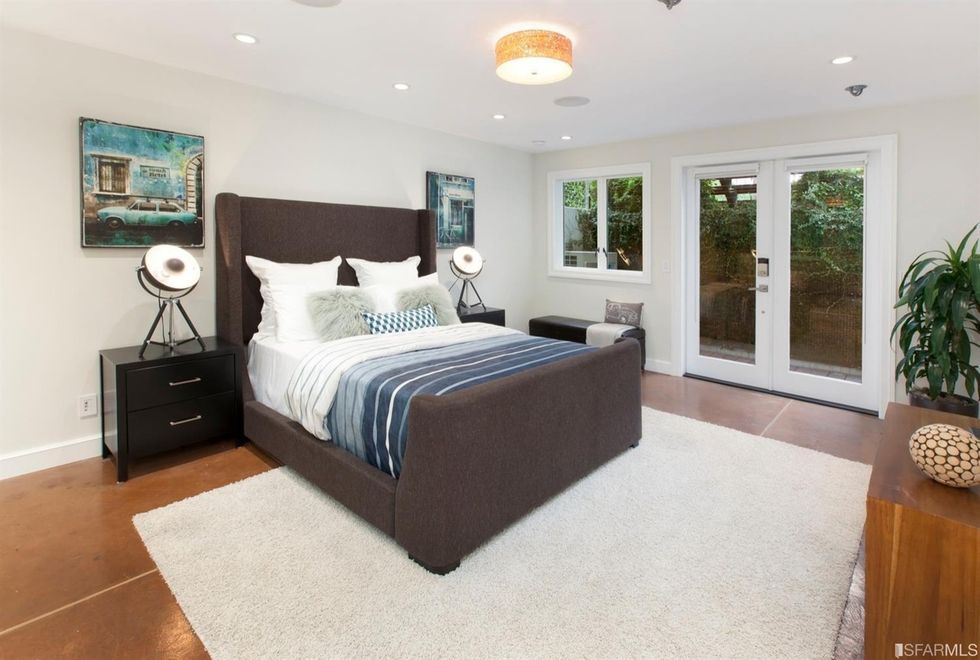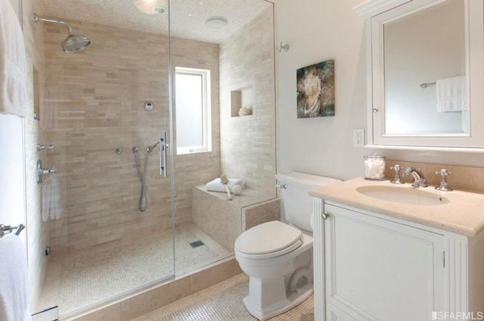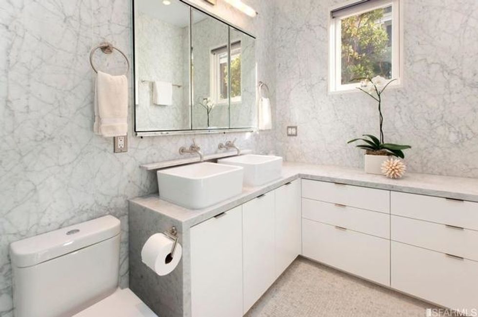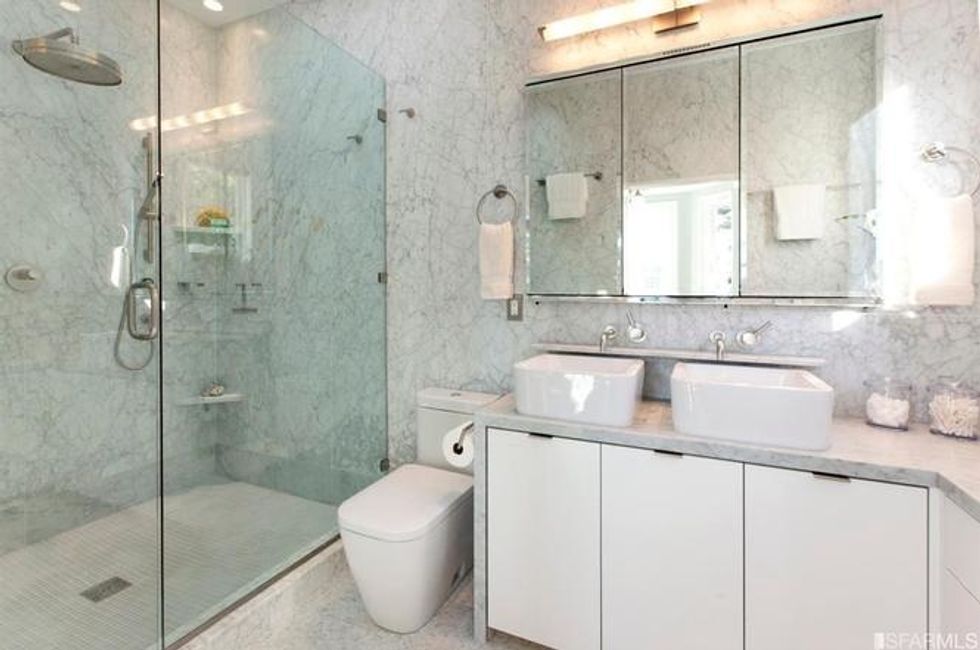 Bathed in natural light from nearly 10-foot ceilings and four windows, the master bedroom upstairs has sleek, custom built-in cabinets, en suite master bath with double vanities, and a skylight over the rain shower. Three additional bedrooms, an office, and four-and-a-half bathrooms ensure there's room for everyone.