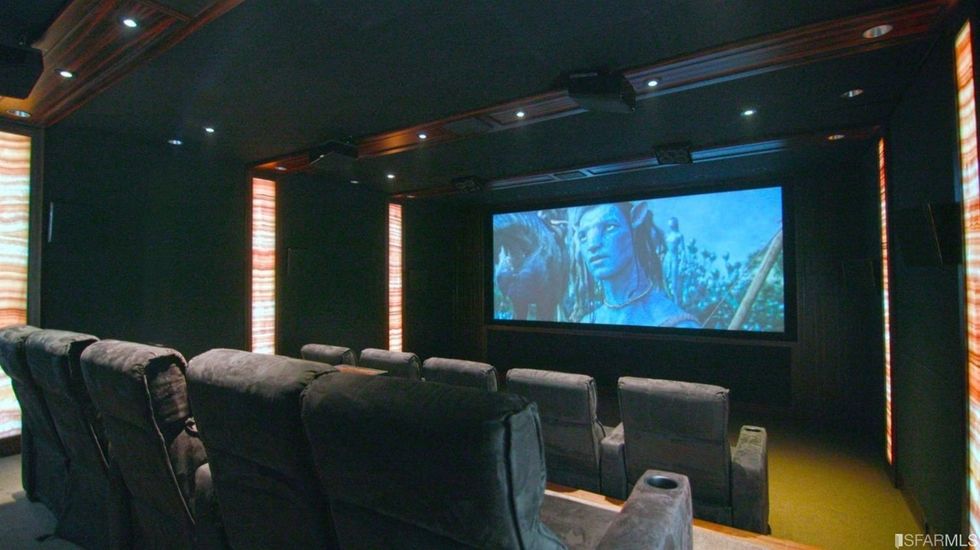 The ground floor holds a suite of flex rooms that have been used for extra bedrooms and even as a gym; this level also holds the jewel of the home—a state of the art, acoustically engineered Dolby Atmos movie theater that can seat 10 people at least. Oh, and there's secure parking for multiple cars as well as an electric charger for your Tesla.