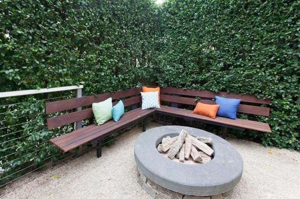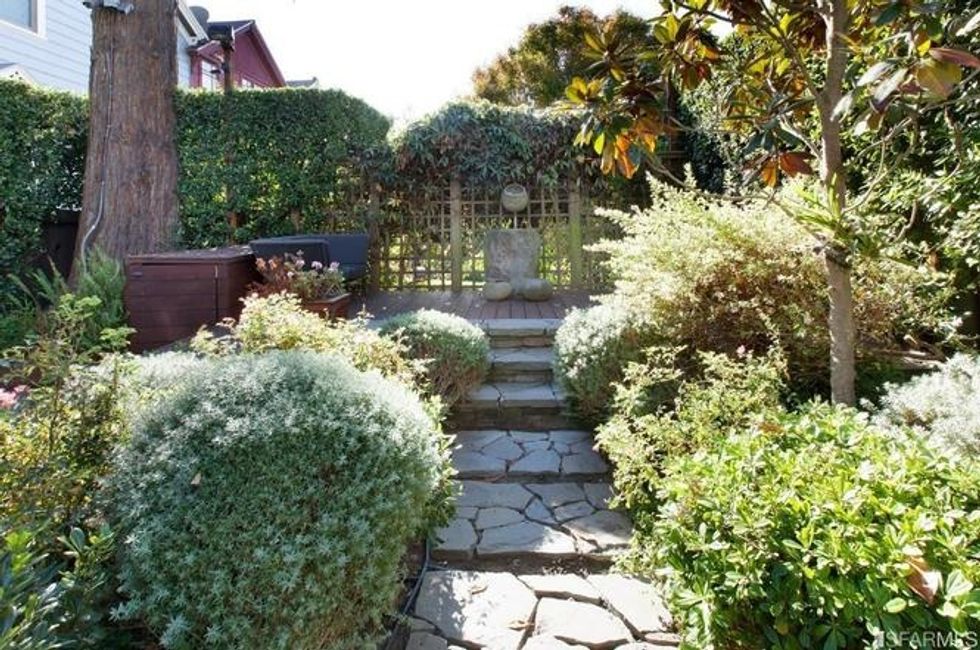 Make your way down the stairs to the garden level, which can also be accessed from the front of the house. A bedroom with en suite bathroom and steam shower takes up this space, along with storage beneath the stairs and a family room with a sheltered deck with heat lamps. The south-facing garden just beyond can be taken in from all levels. Manicured landscaping on multiple tiers and around the home provide endless zen-filled nooks to soak up the sun or hide away with a book, including a raised seating area by a redwood tree with a fountain, as well as another tucked in a corner with benches and gas fire pit.