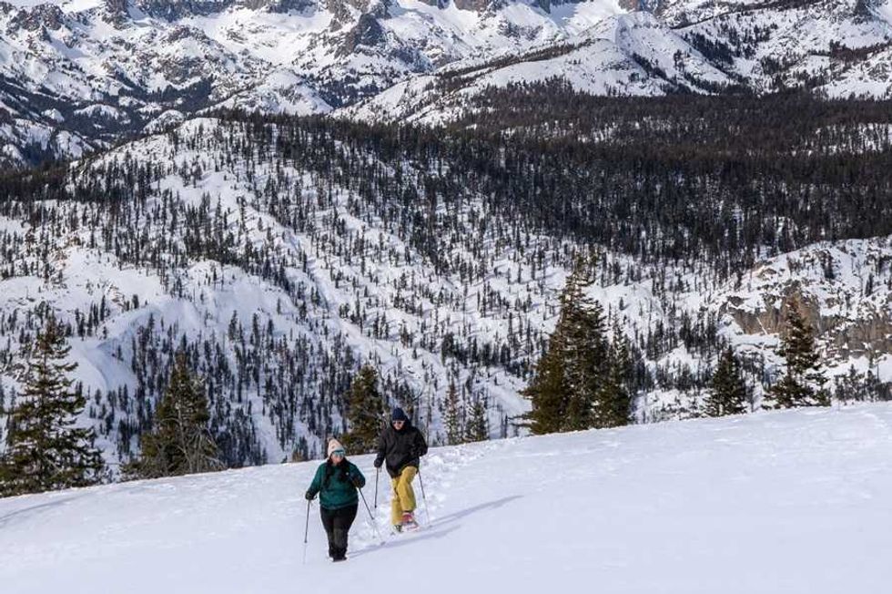 At Mammoth Lakes on the eastern slopes of the Sierra, the snow is just as deep and powdery as it is in Tahoe with a fraction of the crowds. On its best snowshoeing and cross country skiing trails ($49/adult day pass 23-65, $10 kids 5-12, $39/youth 13-22, $45/seniors), you’ll find stunning vistas, frozen lakes, and quiet forest kingdoms of pine, fir, and juniper. Explore Mammoth’s iconic skyline featuring the Minarets on the gently sloping, beginner-friendly Minaret Vista route, which starts at the main lodge and climbs from 8,909 feet to 9,265 feet in around 2.5 miles. Down in the Mammoth Lakes Basin, a variety of trails accessible via the 2.5-mile Lake Mary Winter Public Access Corridor crisscross the landscape. Although skiers need a pass, snowshoers can access the groomed main trail, the Panorama Dome Loop, and other routes for free. Rental gear and trail maps are available at the Tamarack Cross Country Ski Center and shops in town.