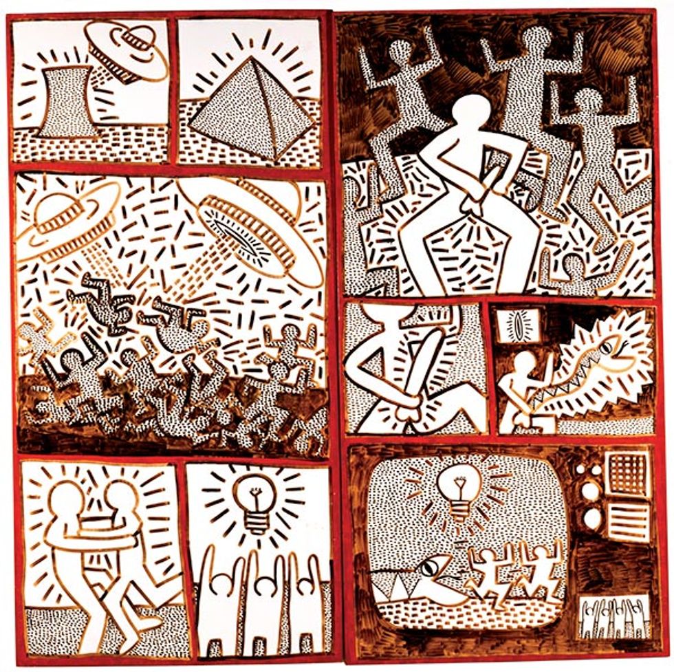 In one of Haring's early subway chalk drawings, a barking dog—described in his New York Times obituary as an “alligator-like creature that looked as if it had emerged from an Aztec hieroglyphic"—shouts a warning against a televised nuclear explosion. Later, during a 1988 visit to the Peace Memorial Museum in Hiroshima, Japan (site of a World War II atomic blast), piles of anonymous skulls and wax figures with molten faces—a gruesome simulation of the effects of the bomb's heat rays—were indelibly seared into his memory. The daily download in his journal was distinctly woeful: “Who could ever want this to happen again?" he wrote. “To anyone?"