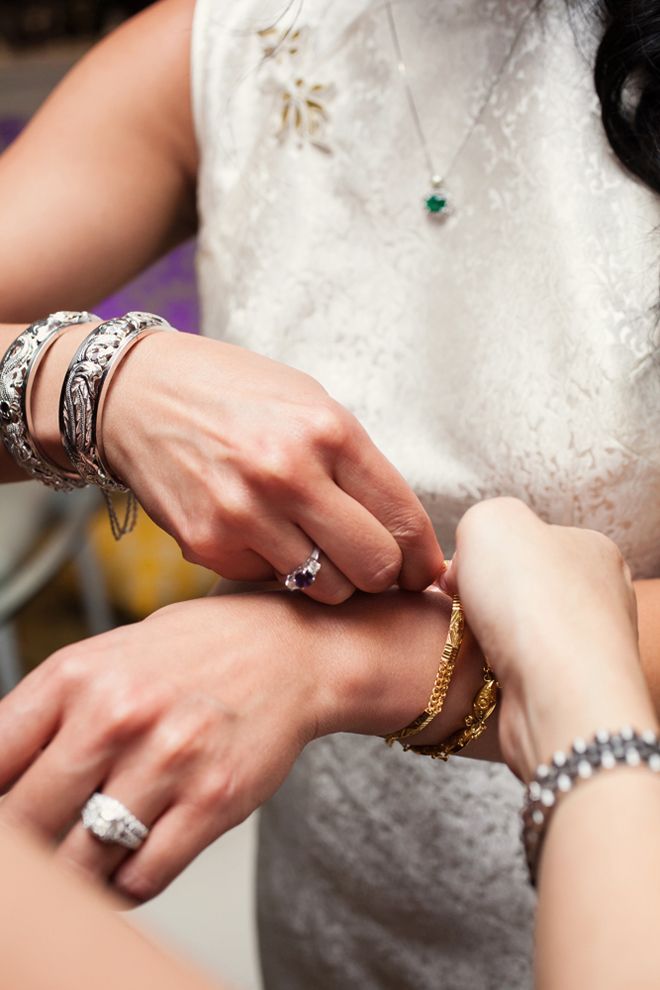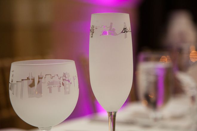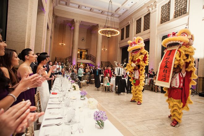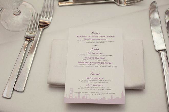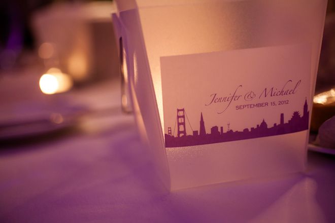 Hues of purple lit up the room with the help of romantic candlelight and elegant high floral arrangements. All the while, the sounds of Frank Sinatra, Dean Martin and Nat King Cole completed the classic ambiance. We used a motif of the iconic San Francisco skyline as the central element to a lot of the graphics in the wedding: on the the cake, save-the-dates, thank-you cards, even for the dance floor lighting. To pay homage to my Chinese heritage, I had a couple of surprises for my guests–our grand entrance was accompanied by an energetic lion dance performance, and I changed into a Cheongsam (a Chinese dress from the 1920s) for the bouquet toss and the rest of the evening. Even Mike wasn't told about my dress!