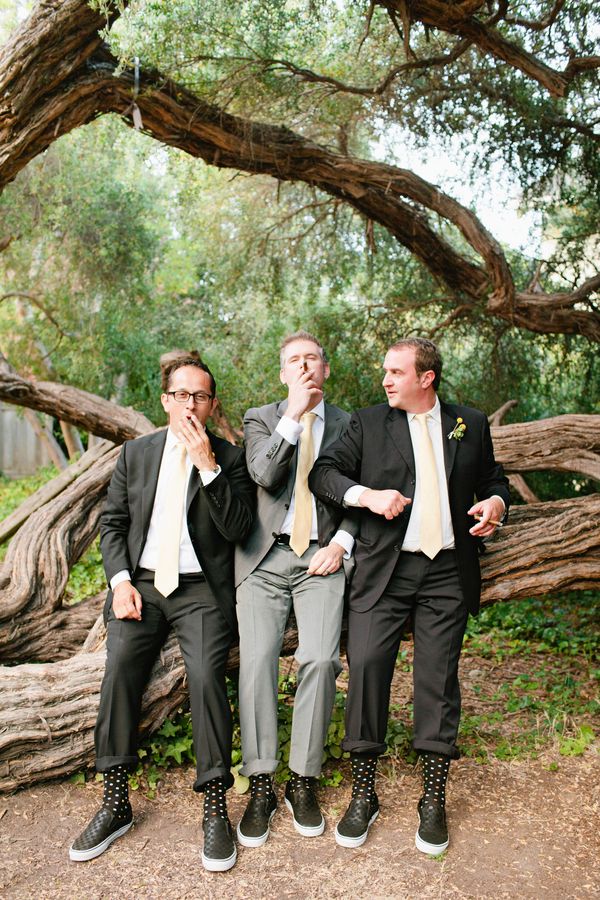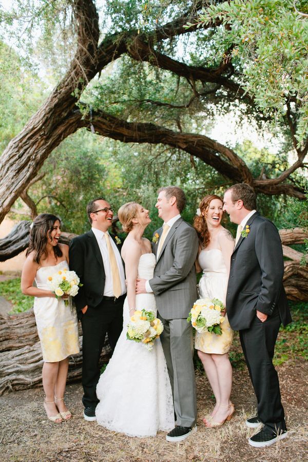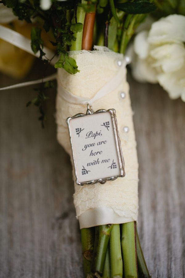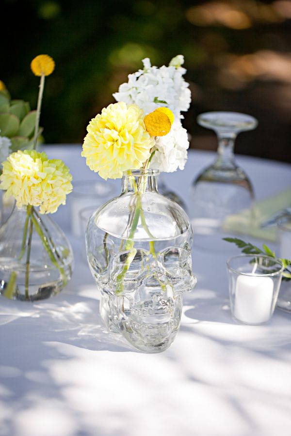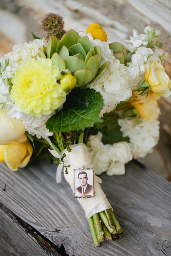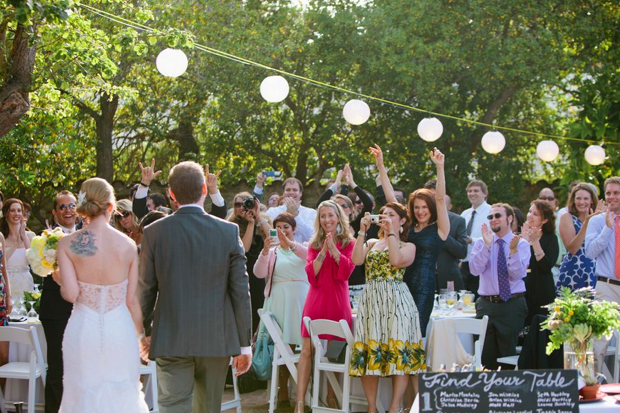 The bride wore a customized Casablanca gown with Nina jewelry and a Tessa Kim birdcage veil. The bridesmaids wore beautiful yellow and cream ML Monique Lhullier dresses. Kristin honored her father's memory with a touching charm tied to her bouquet featuring his photograph and the words 'Papi, you are here with me'. Guests were served an assortment of sweets, including a tiered lemon chiffon cake, a red velvet 'dia de los muertos' groom's cake, and a variety of cupcakes from Fluff Cupcakery. A homemade photo booth was also made available to guests, as they snapped away and added their polaroids to Kristin and Rob's guest book with well wishes.