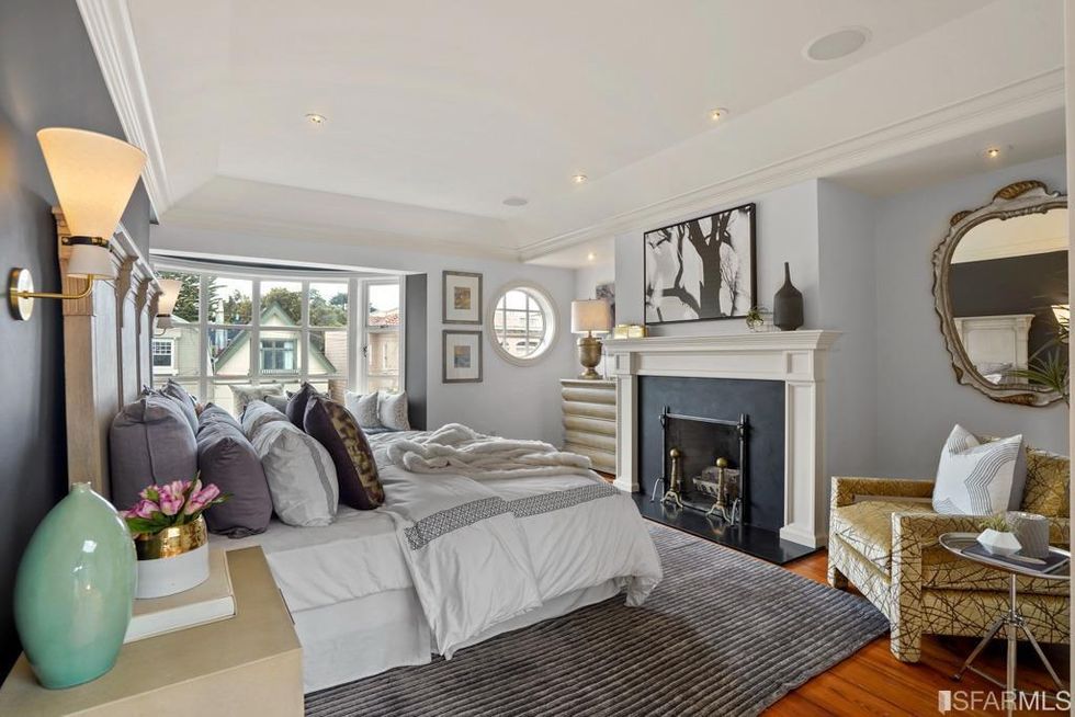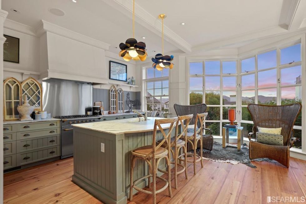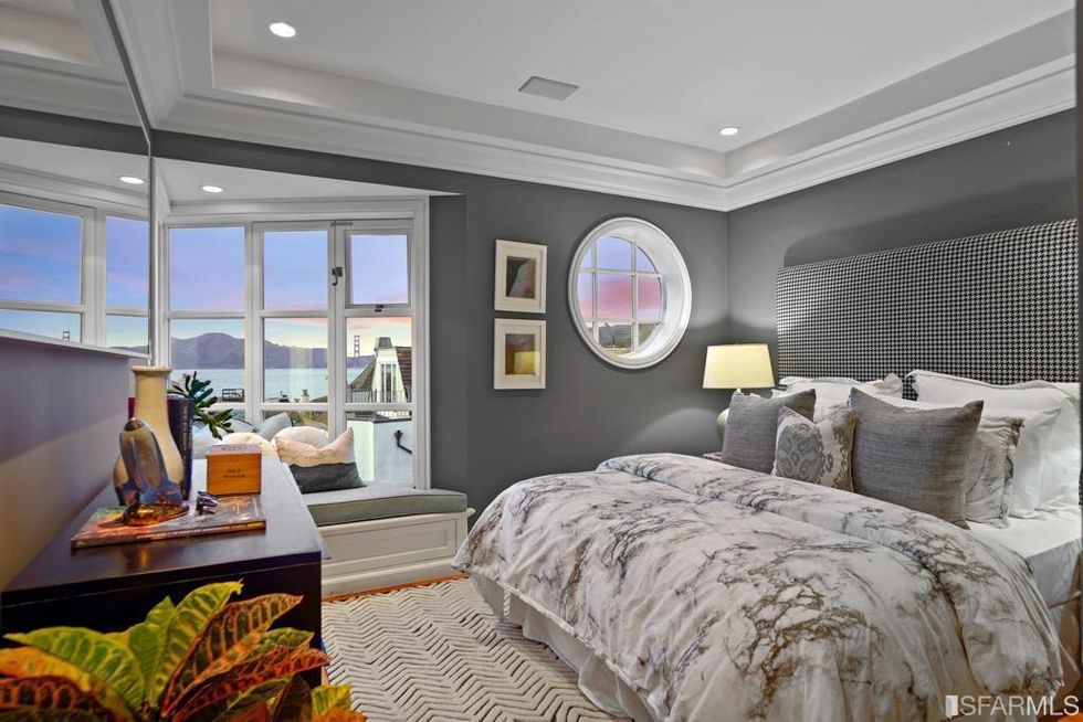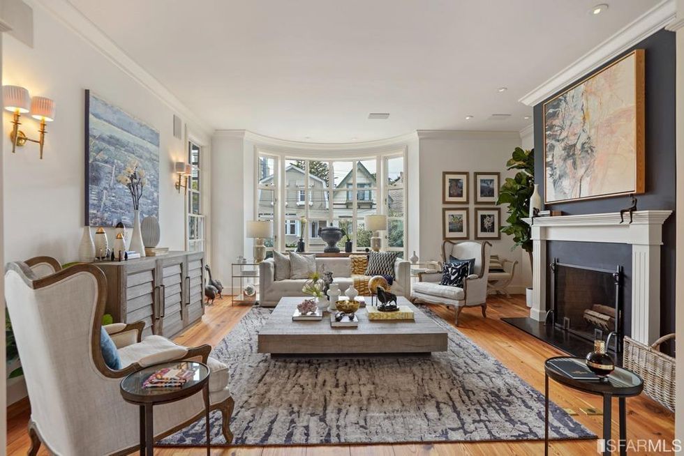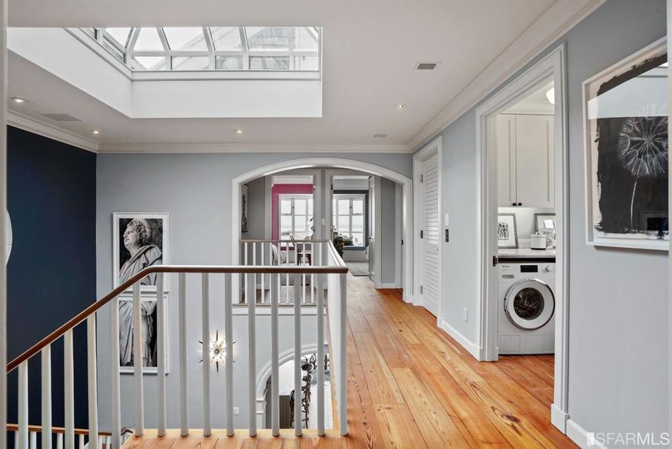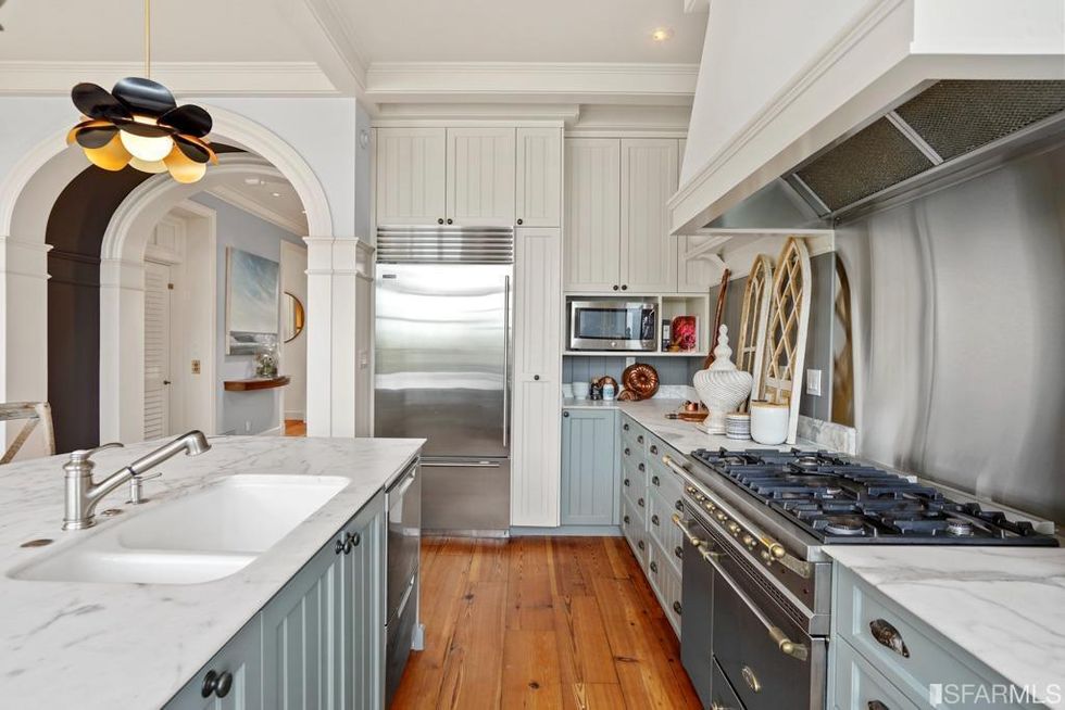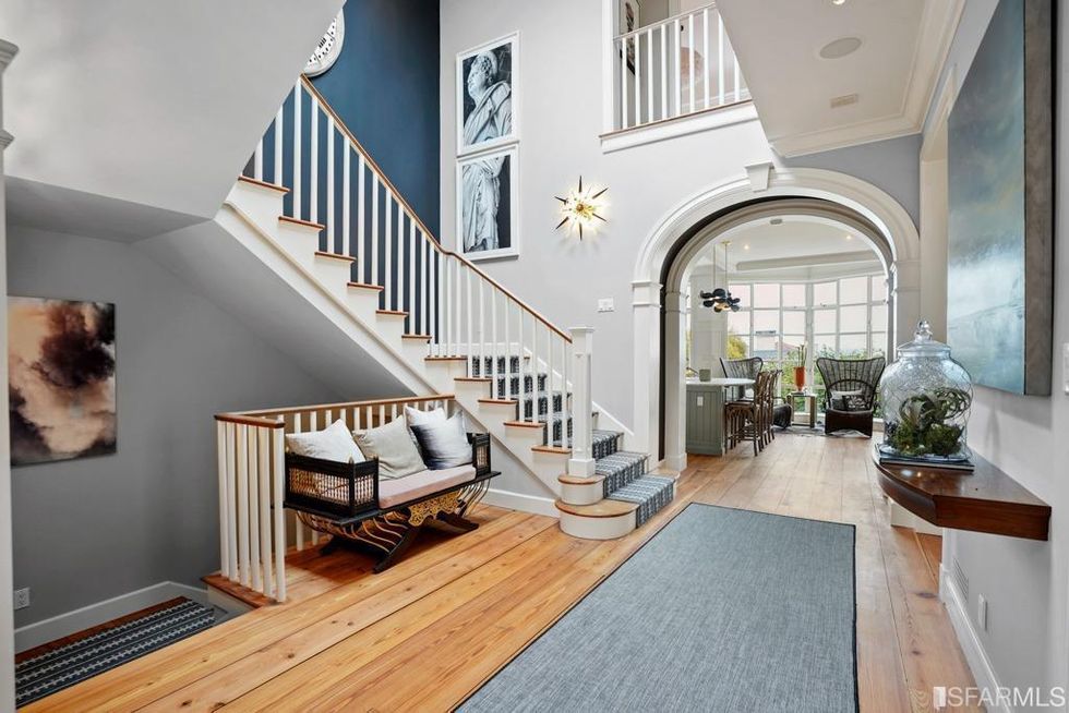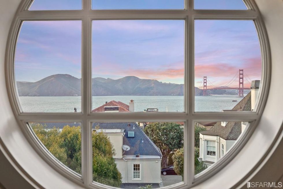 At street level, a grand foyer opens to the formal living room at left, which is illuminated by one of the curved window banks that look out to the Golden Gate Bridge, and the gourmet kitchen and dining area at right via elegant open archways and crown moldings with a 19th century feel.