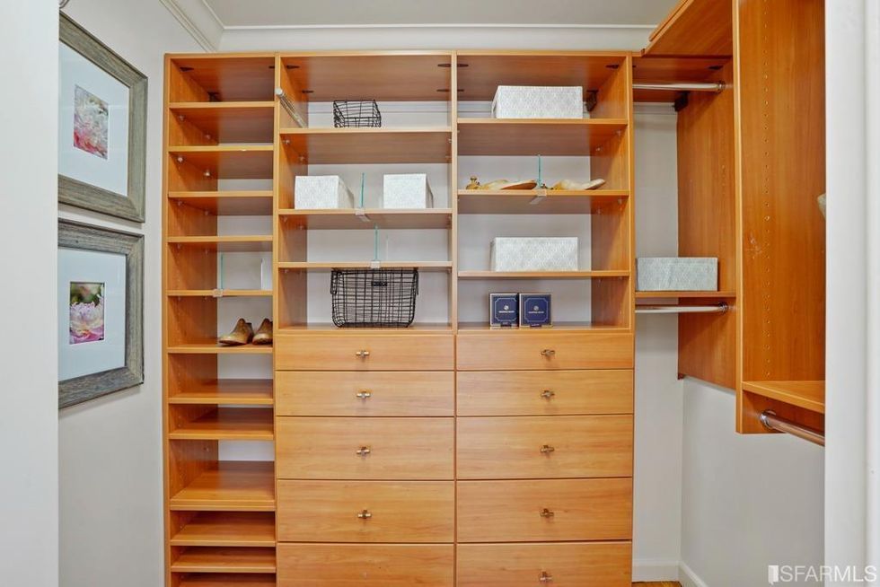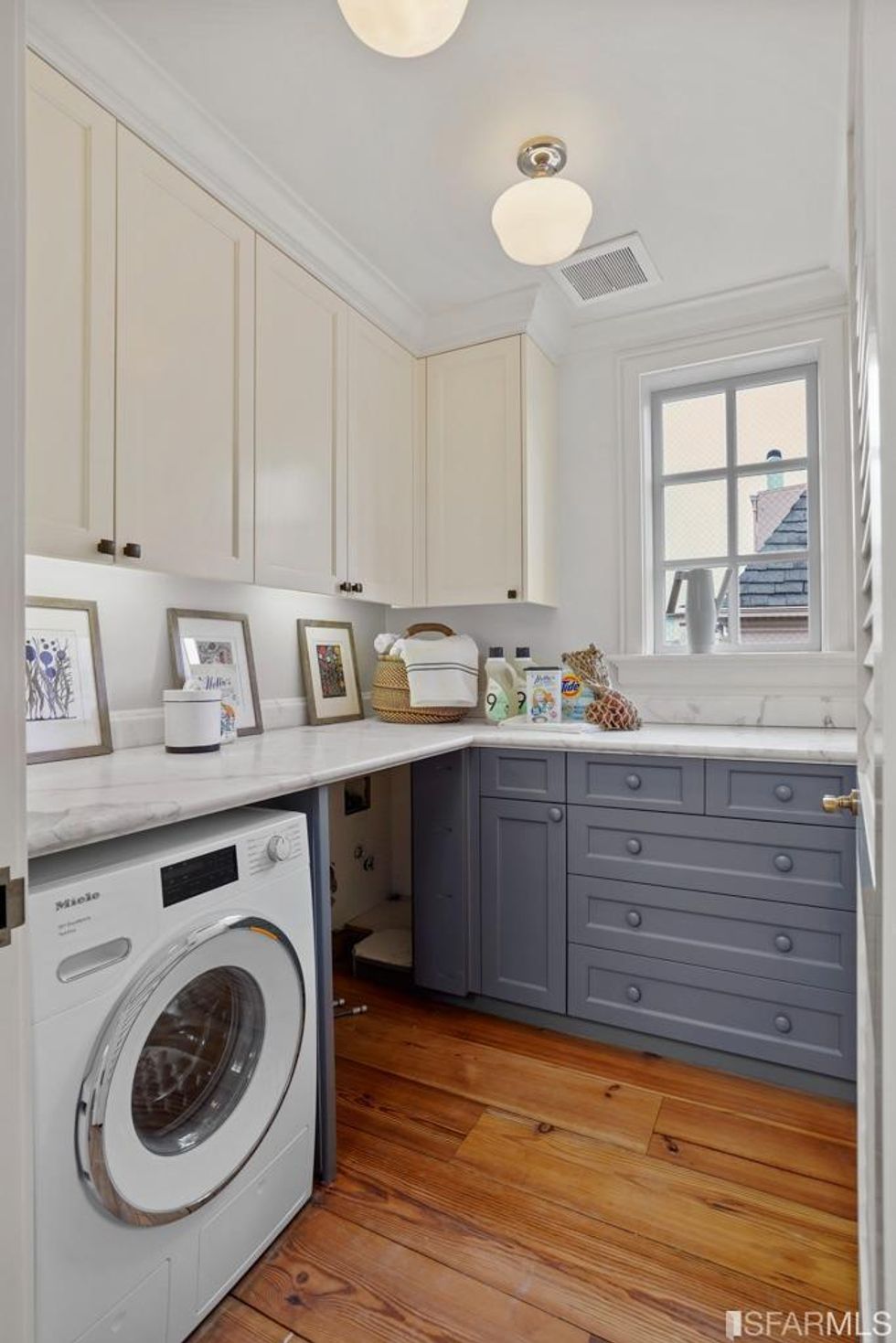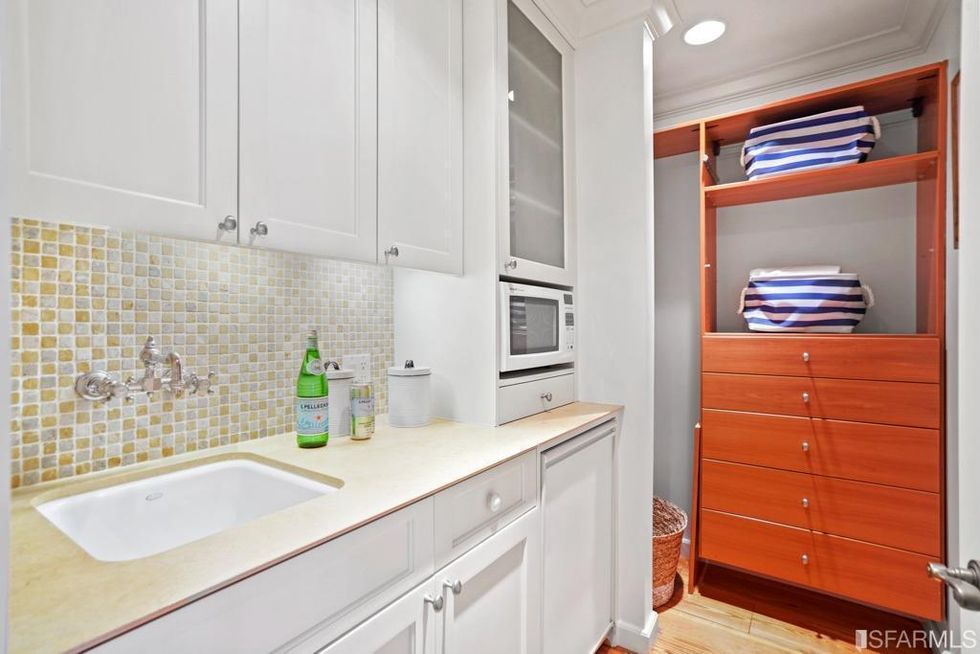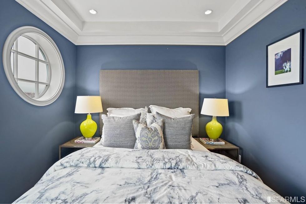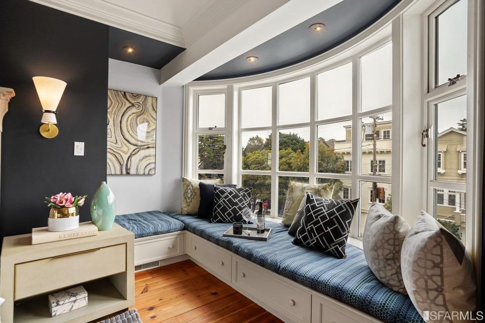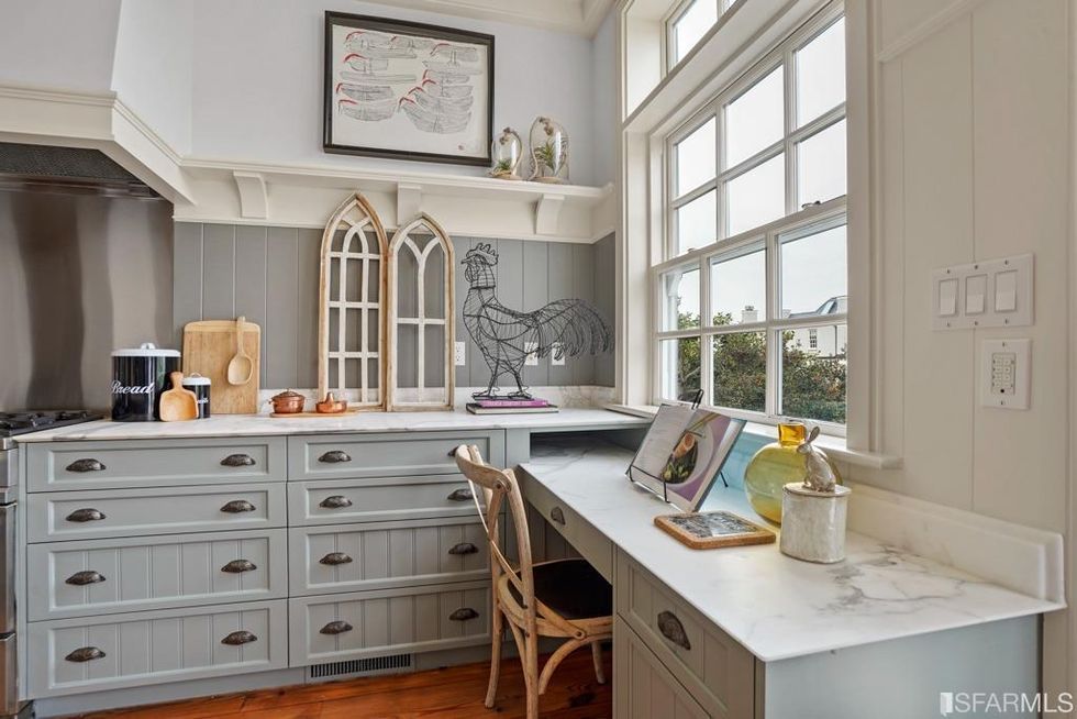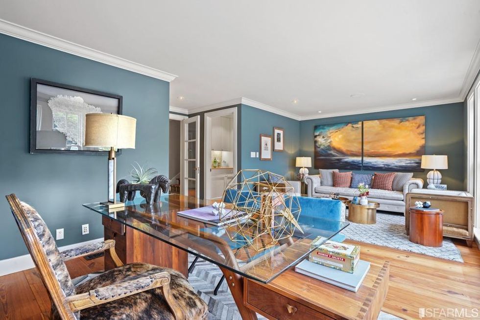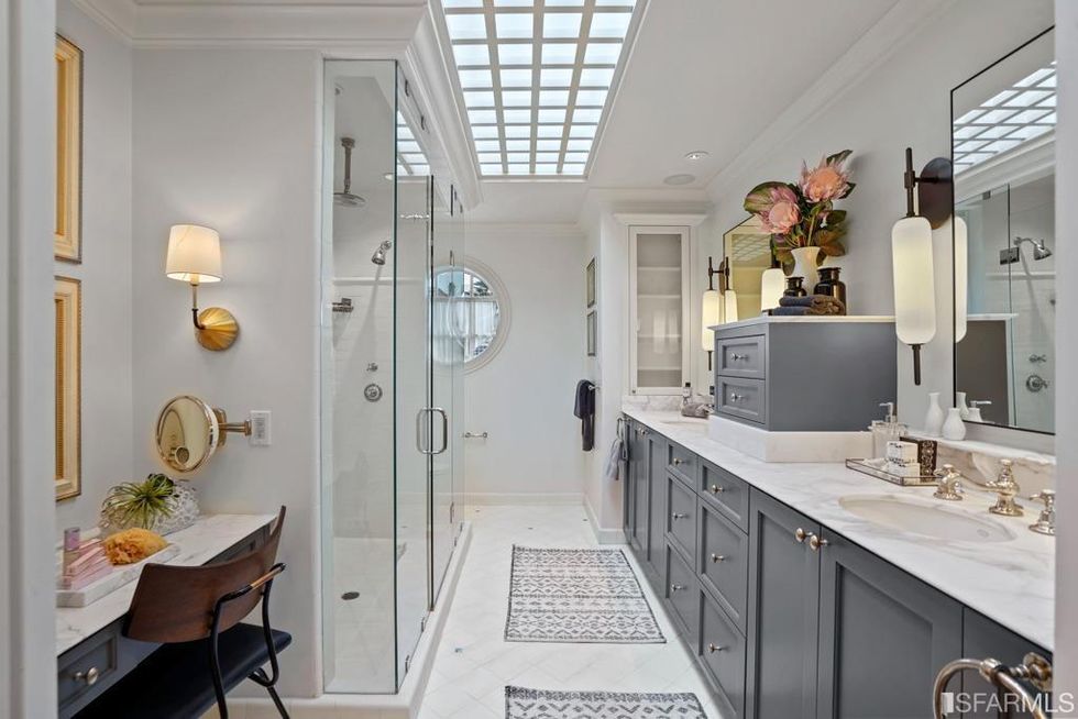 At street level, a grand foyer opens to the formal living room at left, which is illuminated by one of the curved window banks that look out to the Golden Gate Bridge, and the gourmet kitchen and dining area at right via elegant open archways and crown moldings with a 19th century feel.