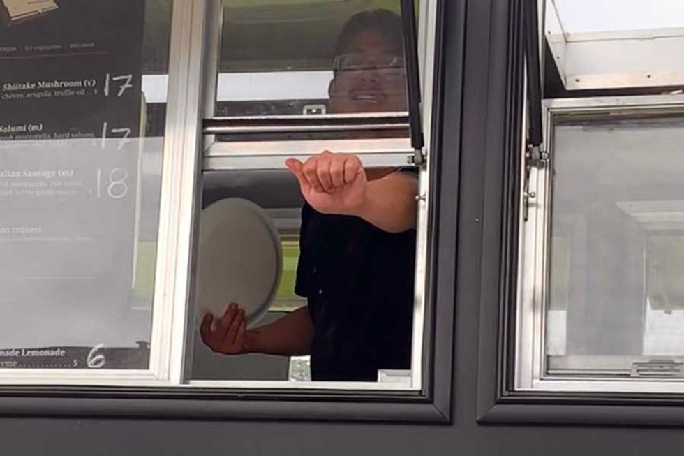 It only takes 90 seconds in the wood-fired oven to bake pizzas to lightly charred perfection, but, depending on the length of the line, it may take several minutes for an order to be ready. If customers are distracted and don’t see the hand making their letter—a “V,” for example, that tells them that their order is ready—the Deaf worker will write the letter on a whiteboard and wave it vigorously out of the window to attract their attention. The whiteboard can also be used for more detailed instructions or questions.