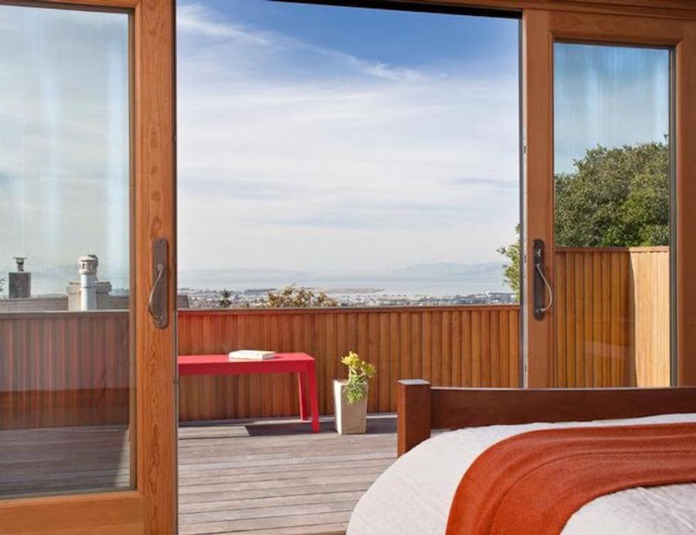 The Sakais already enjoyed an impressive bay view; they could even catch a glimpse of the Golden Gate Bridge from their roof. By adding a second story, they were able to have their dream: a second-floor master suite with a view (an even better one). Sliding glass doors frame one of California's most iconic scenes.