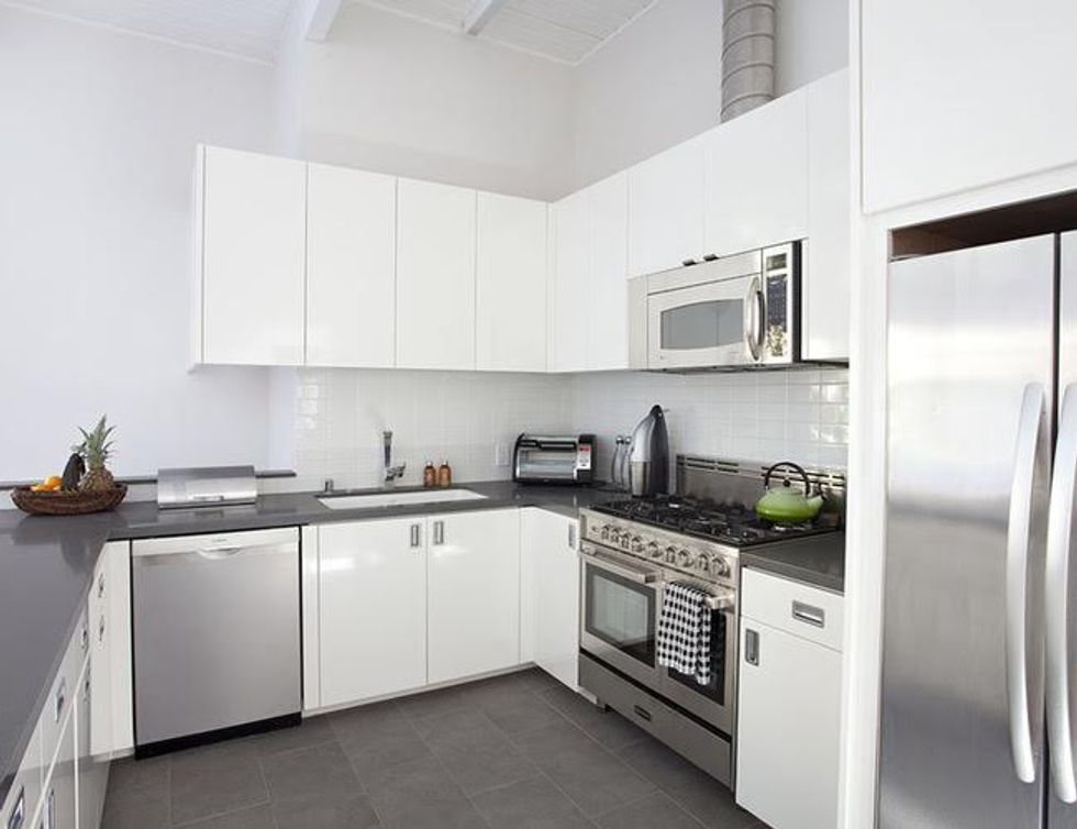 The remodeled kitchen replaces the old kitchen and a bathroom. Custom wood cabinetry, Caesarstone concrete countertops, a snowy glazed tile backsplash and flushed stainless steel appliances help keep things simple and sleek.