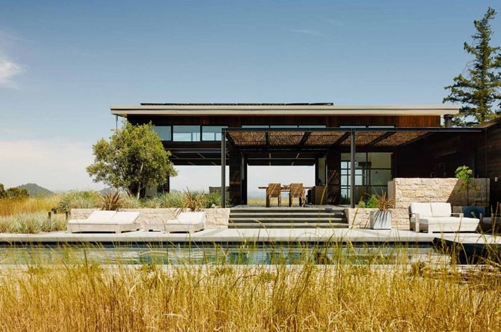 Comprised of two separate single-story wings, this brand new home on a hilltop near Healdsburg, designed by San Francisco-based Feldman Architecture, puts indoor-outdoor boundaries to the test. The larger wing runs along the hill's ridge and includes the home's great room, which features four oversize glass panels that open on a pulley system, adding a bit of drama to the sweeping views of Sonoma Valley. Vistas can also be admired poolside, on the gorgeous outdoor patio—essentially an extension of the living room—or while sitting around the outdoor fire pit, designed by Arterra Landscape Architects.