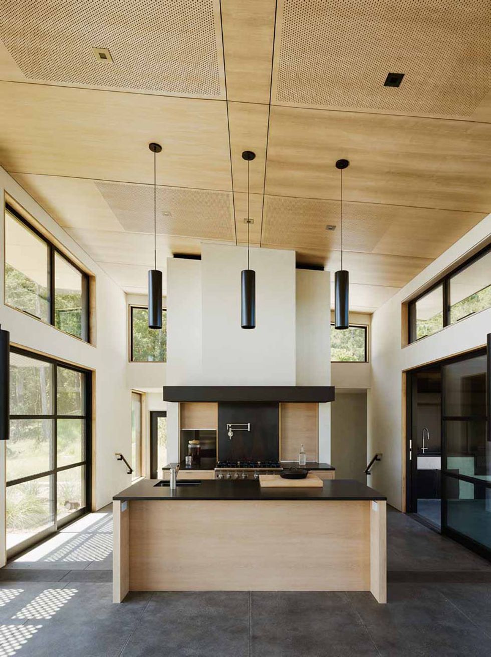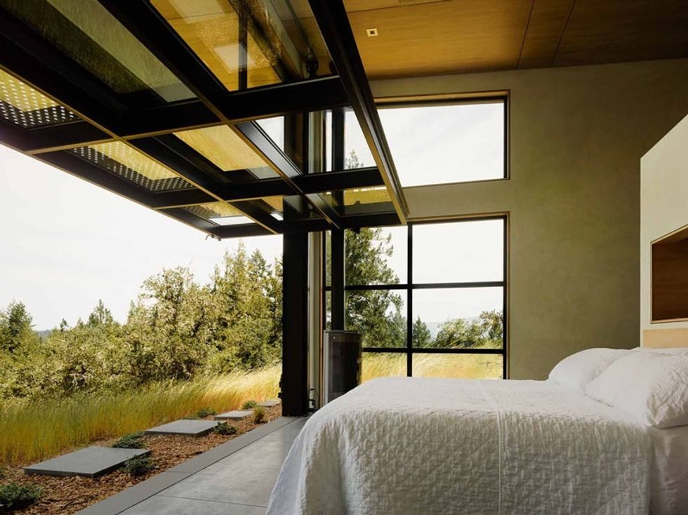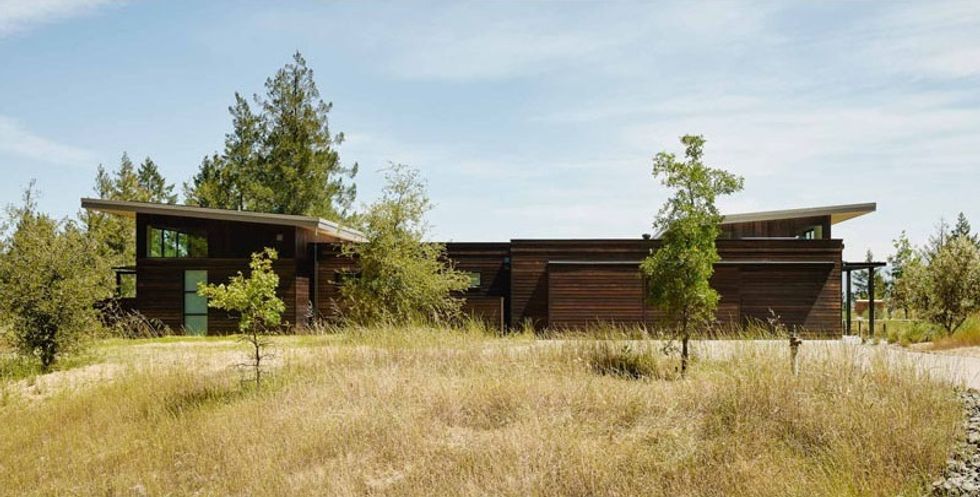 The home's materials were chosen in synergy with the outdoors: Oak beams are used in the kitchen, for example, while many glass windows flood the interior with natural daylight. The concrete flooring and lofty ceilings make the home a cool and airy place to be on a scorching summer's day in Wine Country.