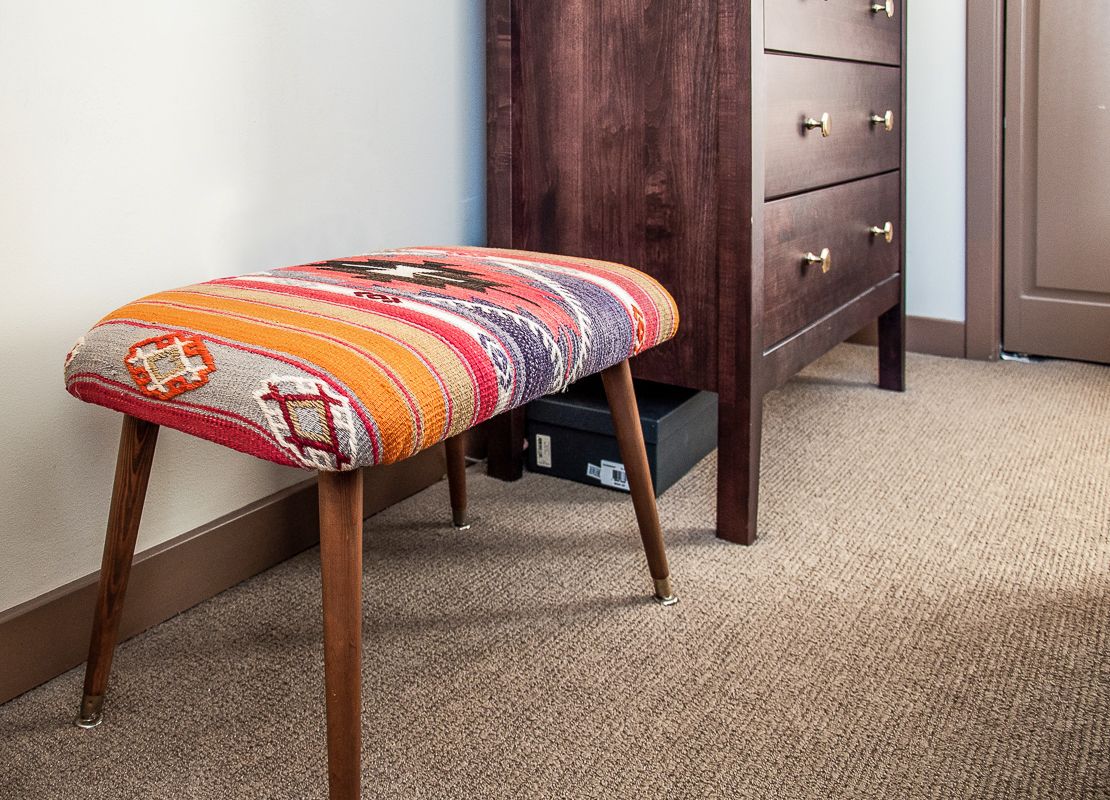 Kilim textiles add color and texture in the bedroom. Adding brass drawer pulls made the furniture feel more expensive.