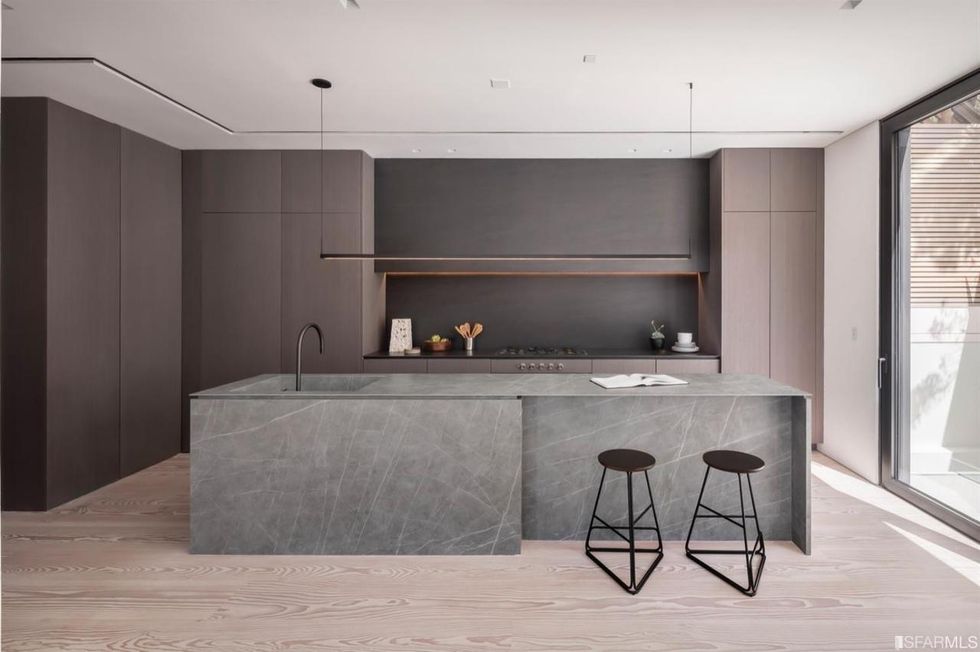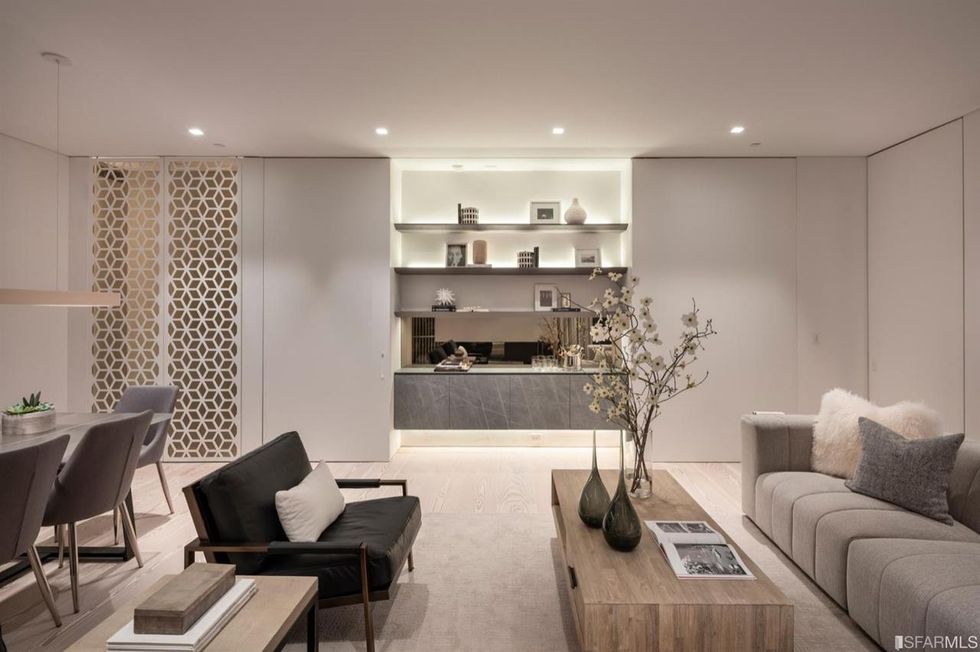 The adjacent living and dining areas are flanked by windows and warmed by a contemporary fireplace. The rooms are accented with lattice details, built-in shelving, and hidden sliding doors that reveal a hallway leading to the great room. The kitchen is sleek as can be with custom cabinets, a large central island with bar seating, and Gaggenau appliances.