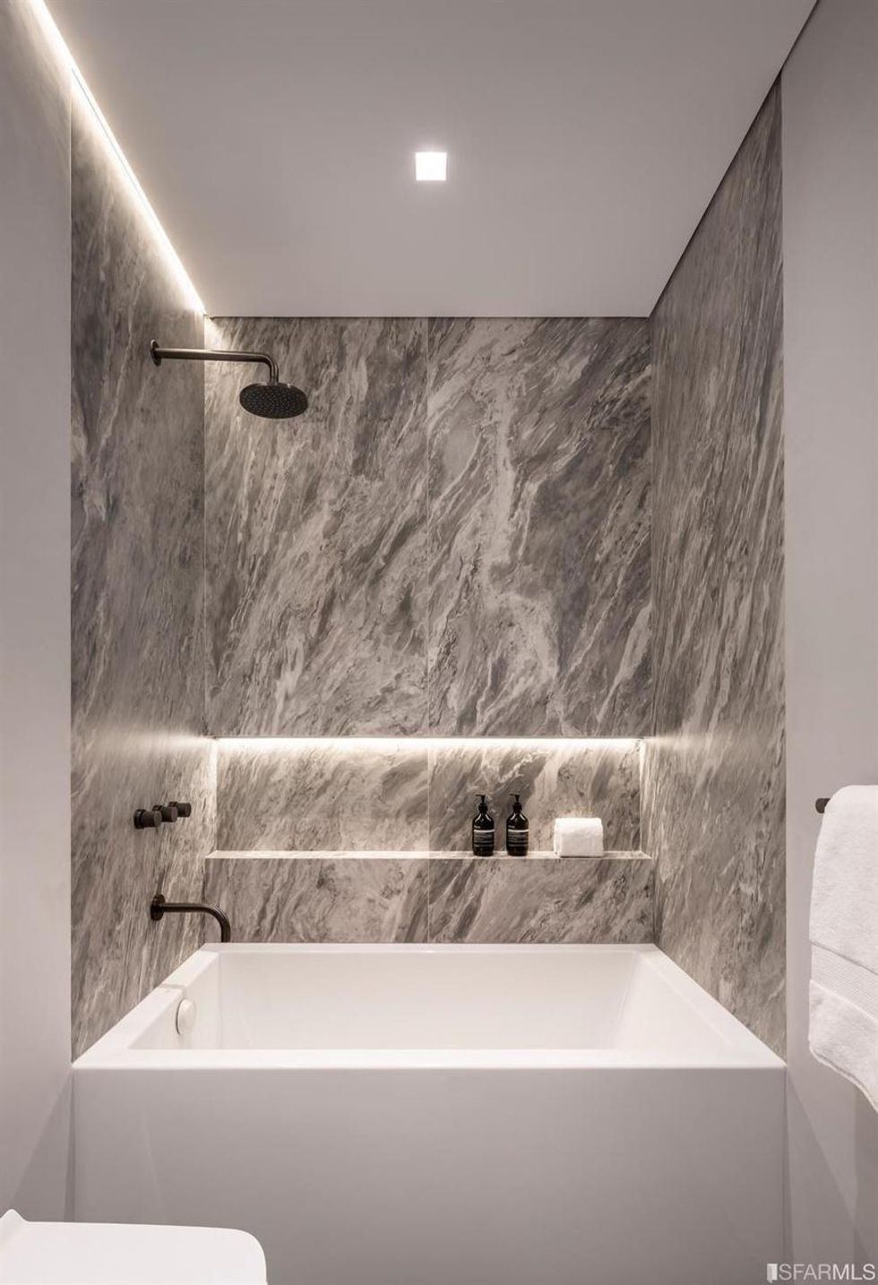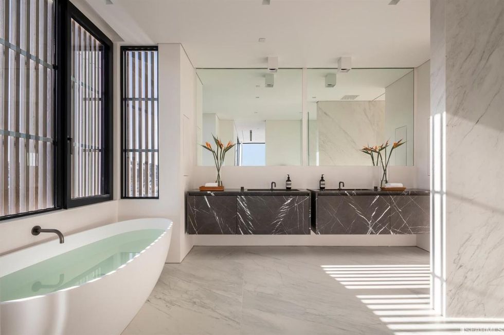 Up the stairs you'll find the primary suite with its own terrace for taking in the view, plus a roomy walk-in closet and spa-like, en-suite bathroom with a floating marble vanity, soaking tub, and expansive dual head shower. Two additional bedrooms, each with their own bathrooms, and a laundry room complete this floor.