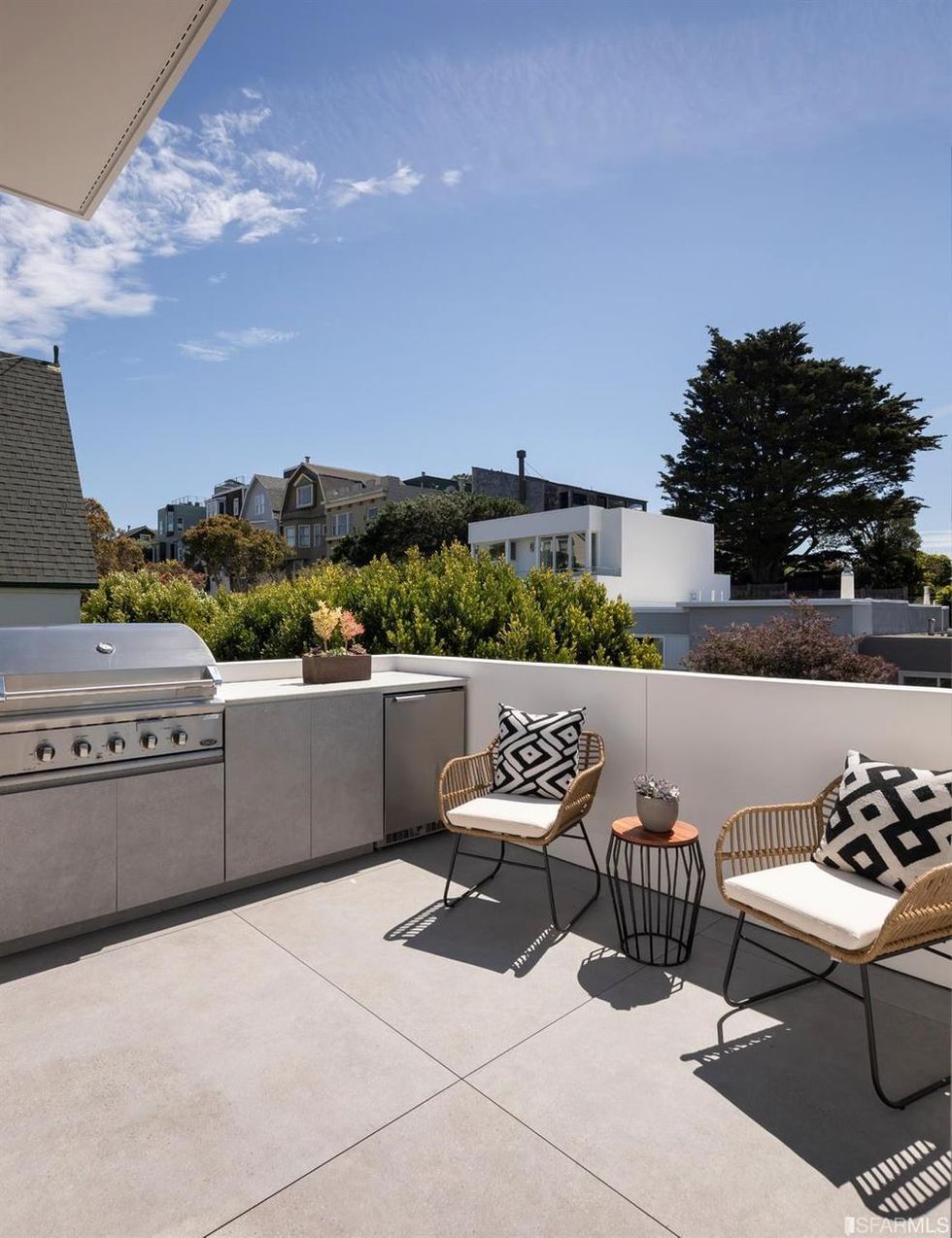 Perched on top is the penthouse with a sunny wraparound terrace and beautiful wood and lattice detail. Residents can dine alfresco here thanks to the outdoor kitchen and wet bar. Afterwards, guests can spend the night in the accompanying bedroom suite, or in the bottom legal unit with bedroom and full bathroom.
