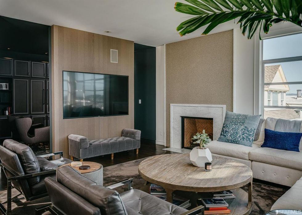 Designed to emphasize open living, the shared areas of the home, including the living room and lower level family room, take advantage of the expansive corner windows and views. Design anchors include a marble fireplace and wood-paneled wall against moody tones.