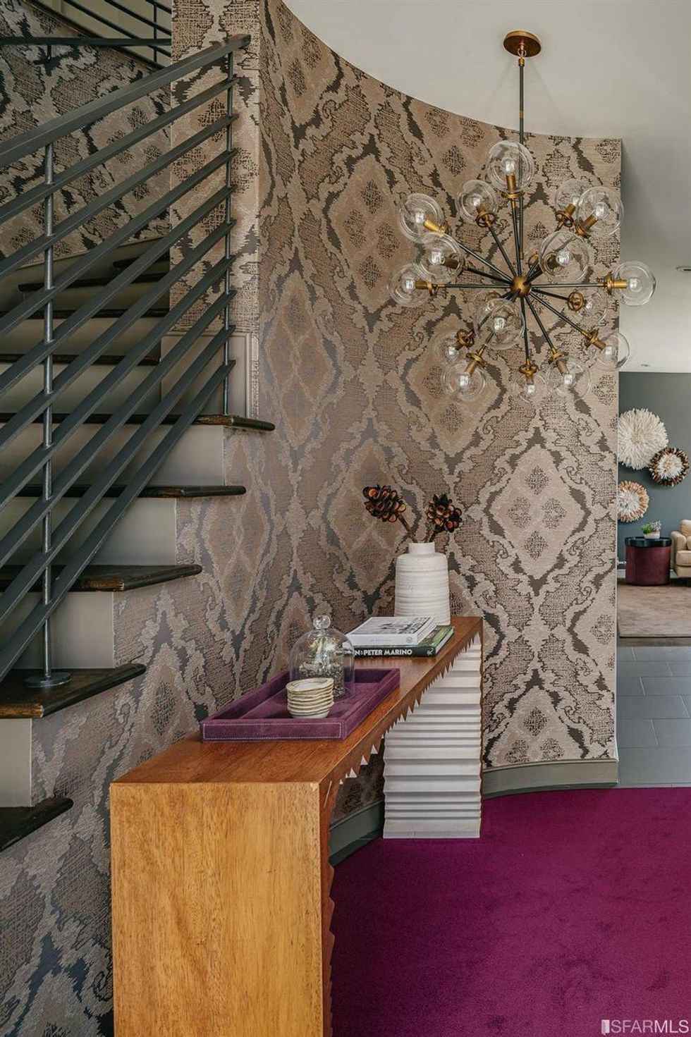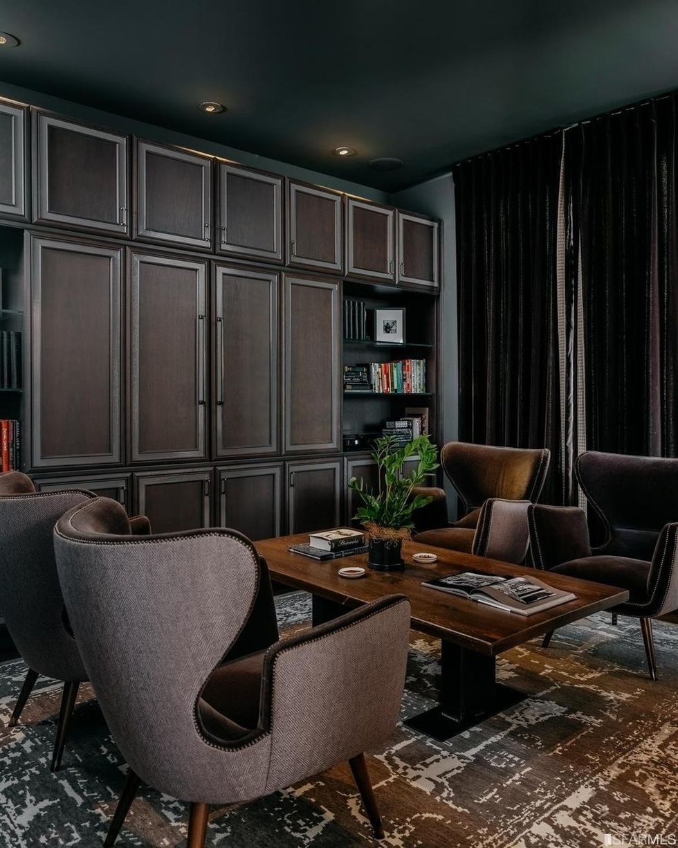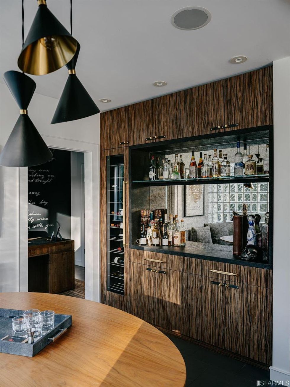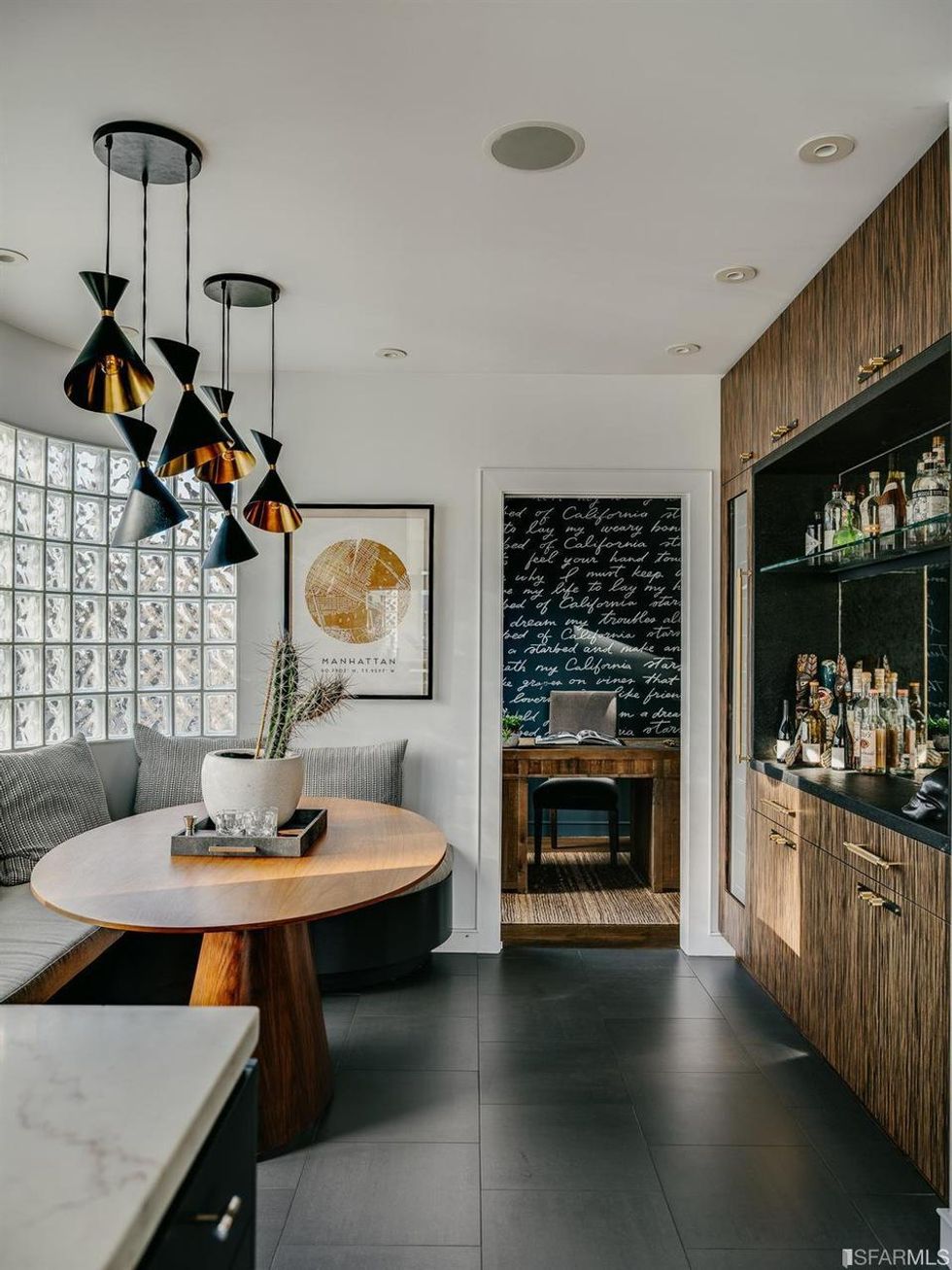 Darker hues permeate areas like the minimalist kitchen and the adjacent breakfast room. A moody wood bar here has ample wine storage. Overhead, Tom Dixon–style pendant lights tie the room together. With a complementary palette and built-in cabinets, the study is a seamless transition.