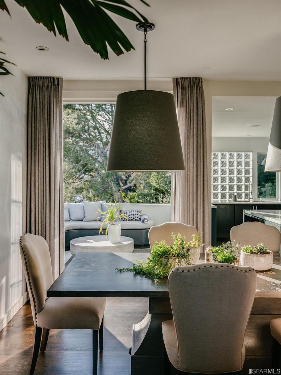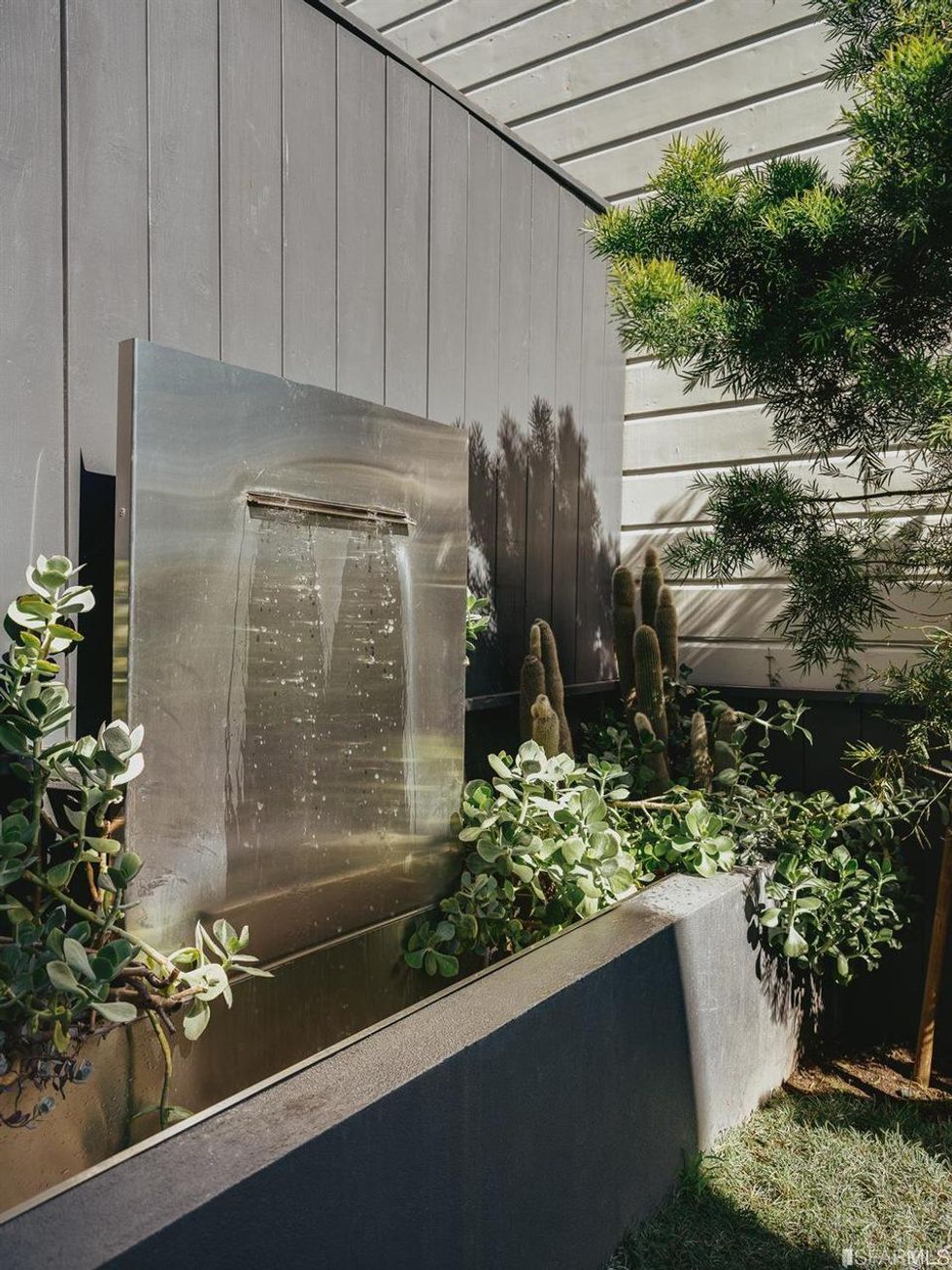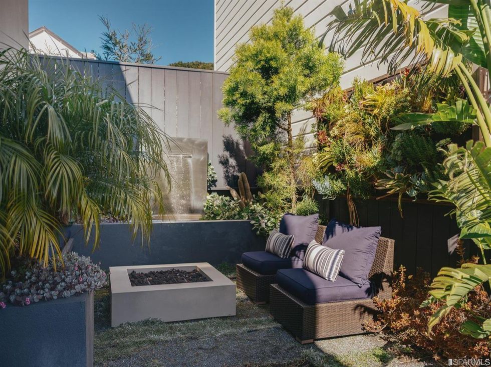 The charming interiors also have access to lovely outdoor spaces. Both the kitchen and dining room open onto a terrace. There's also a garden with a fire pit and wall fountain for all the zen vibes. A one-car garage and additional storage finish out the home.