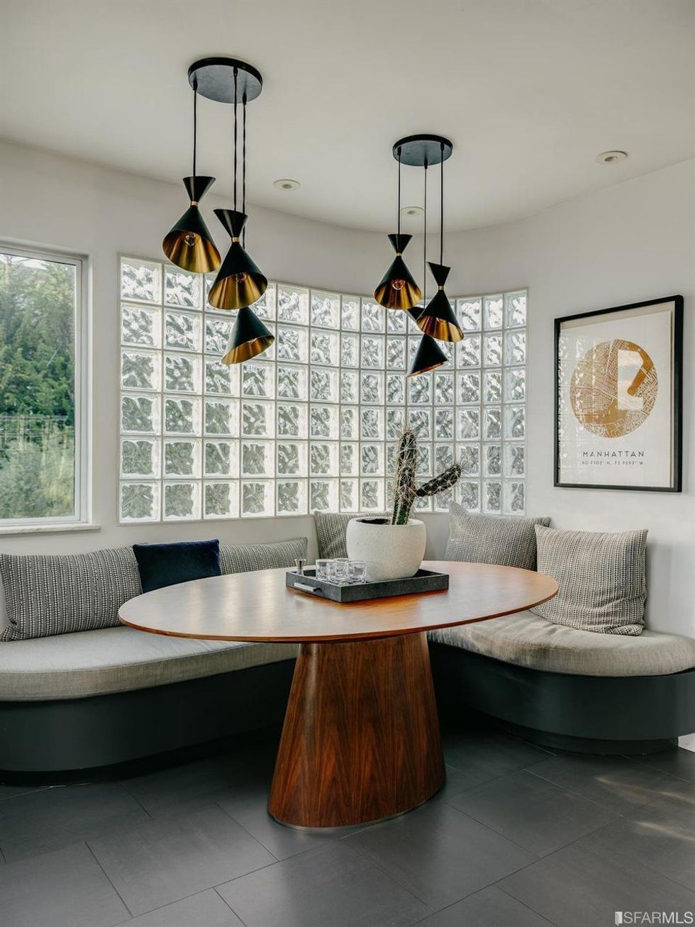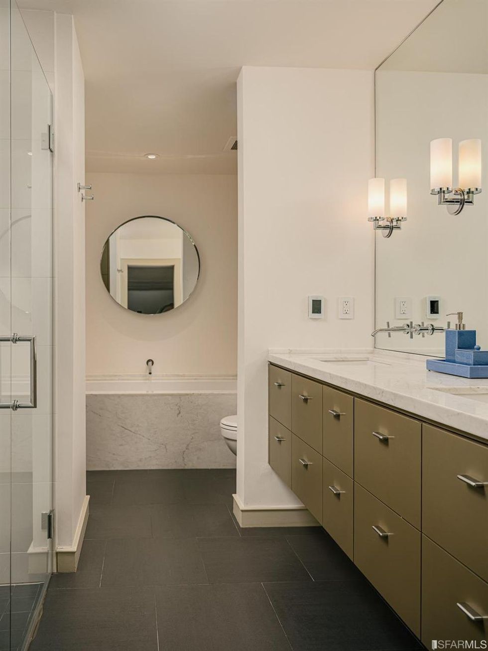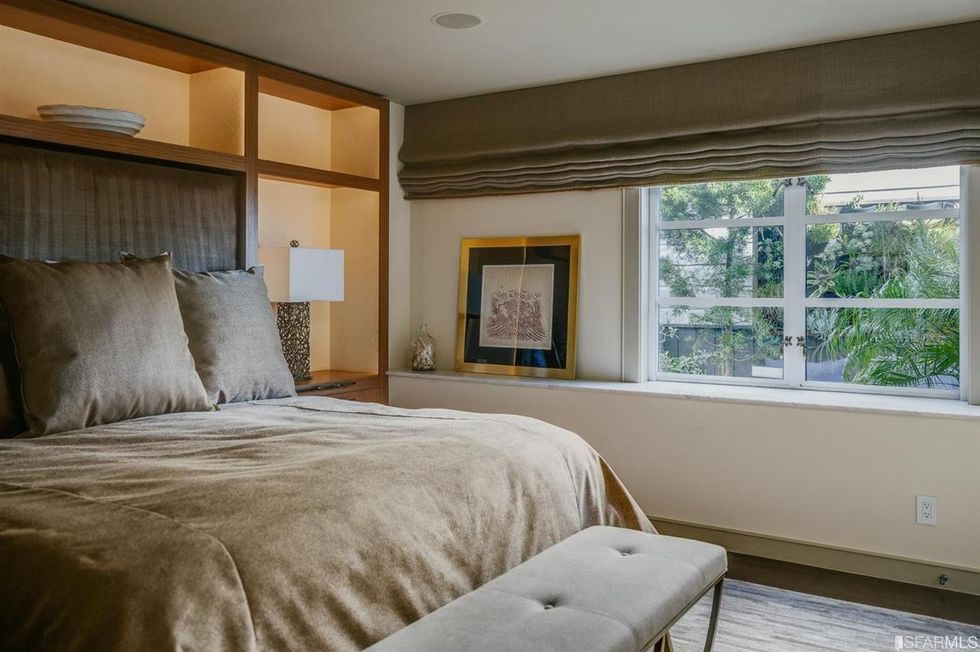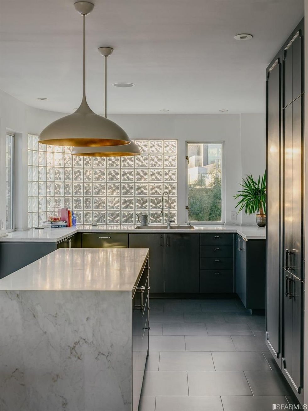 The home's three bedrooms each have unique details such as built-in shelving and more glass block windows. All three-and-a-half bathrooms, have a little added flair with rounded and floating vanities and a marble soaking tub.