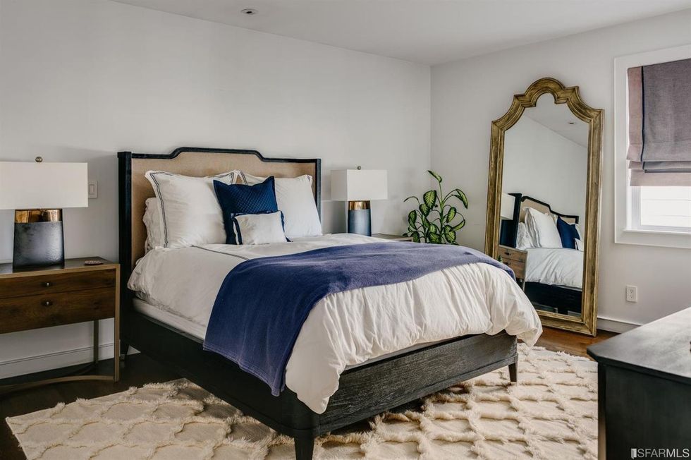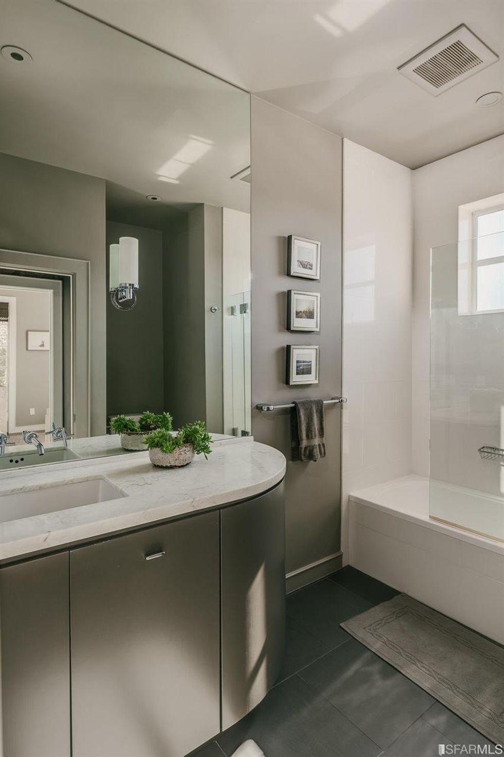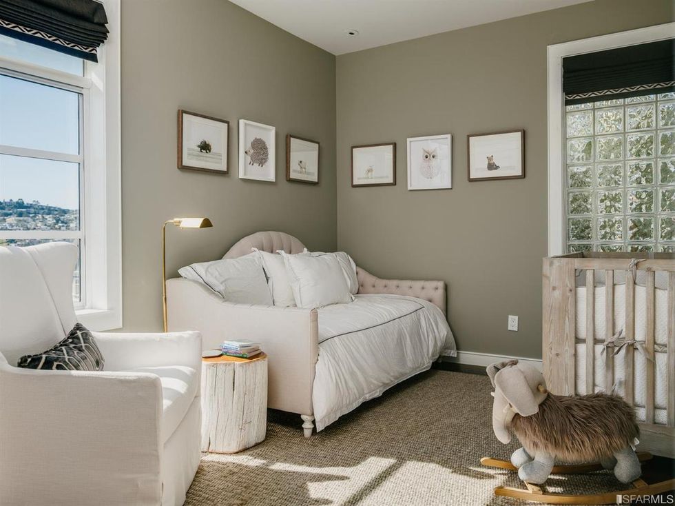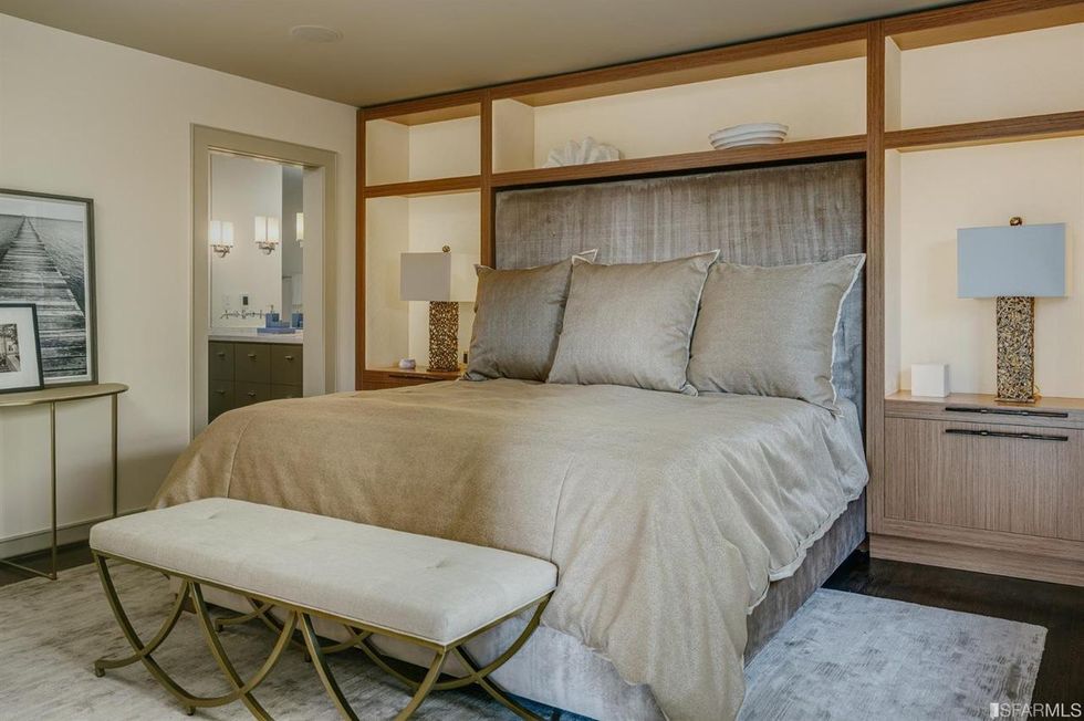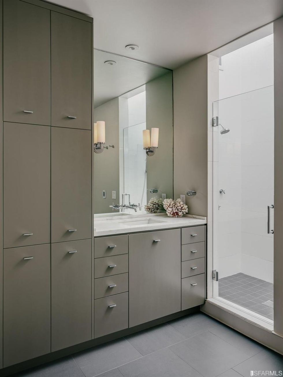The home's three bedrooms each have unique details such as built-in shelving and more glass block windows. All three-and-a-half bathrooms, have a little added flair with rounded and floating vanities and a marble soaking tub.