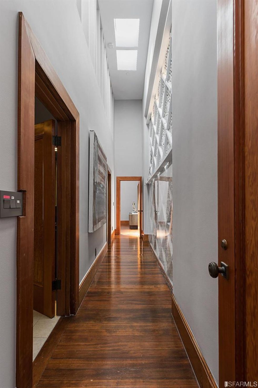 Upstairs, two more bedrooms each have oak and fir hardwood floors, skylights, and perks of their own. The front bedroom has a walk-in closet; the back room overlooks the garden. The skylights shed loads of natural light, creating a gallery-like atmosphere in the mezzanine for viewing the great room below.
