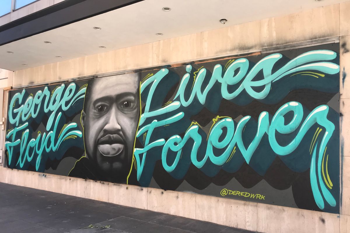 Local artist DeredWRK is behind several of the murals painted in downtown Oakland this week, including this one of George Floyd.