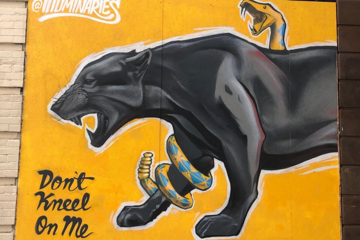 A mural with the words "don't kneel on me" in downtown Oakland, by artist group Illuminaries. Follow them on Instagram.