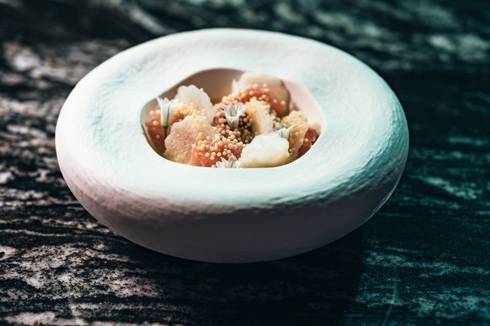 My table is stacked high with pearlescent hamachi crudo in mandarin aguachile, and chubby Hokkaido scallops bathing in shiro dashi and black truffle. I’m greedily polishing off one of the best savory cocktails I’ve had lately—a basil-and-tomato gin drink with parmesan foam they call La Cosa Nostra.