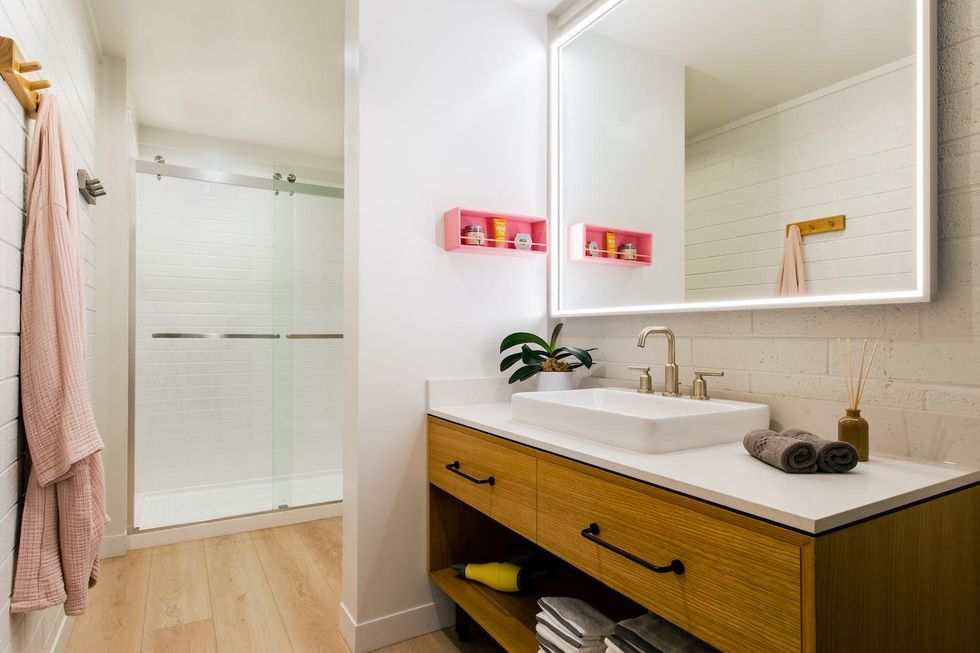 In keeping with the theme, the resort's 50 rooms are minimalist and clean with the feeling of an elevated dorm room (you know, the kind you might see in college brochures, not what you actually ended up with). Wood planks on the ceilings are complemented by white beams and add warmth to the room, as do pops of orange in the mid-century modern furnishings and decor. The throwback motif carries on through black and white photographs from the resort's early days and a Galanz mini fridge in each room.