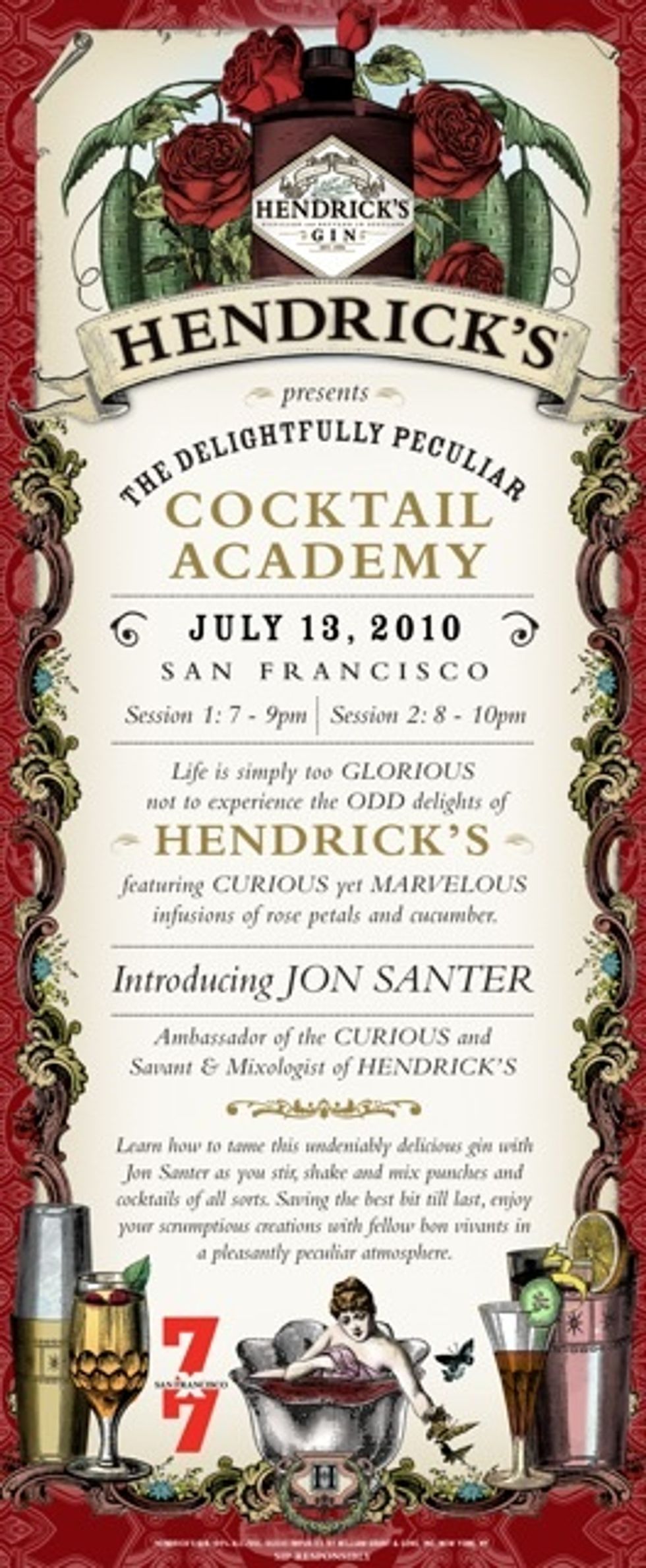 Jon Santer, San Francisco's own award-winning "Ambassador of the Curious and Savant & Mixologist of Hendrick's" conducted lively sessions on how to tame the undeniably delicious gin. After the sessions, students were able enjoy their scrumptious libations with fellow bon vivants in the pleasantly peculiar atmosphere of Prospect.