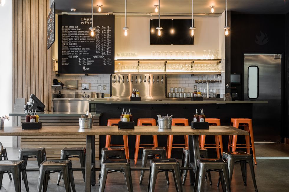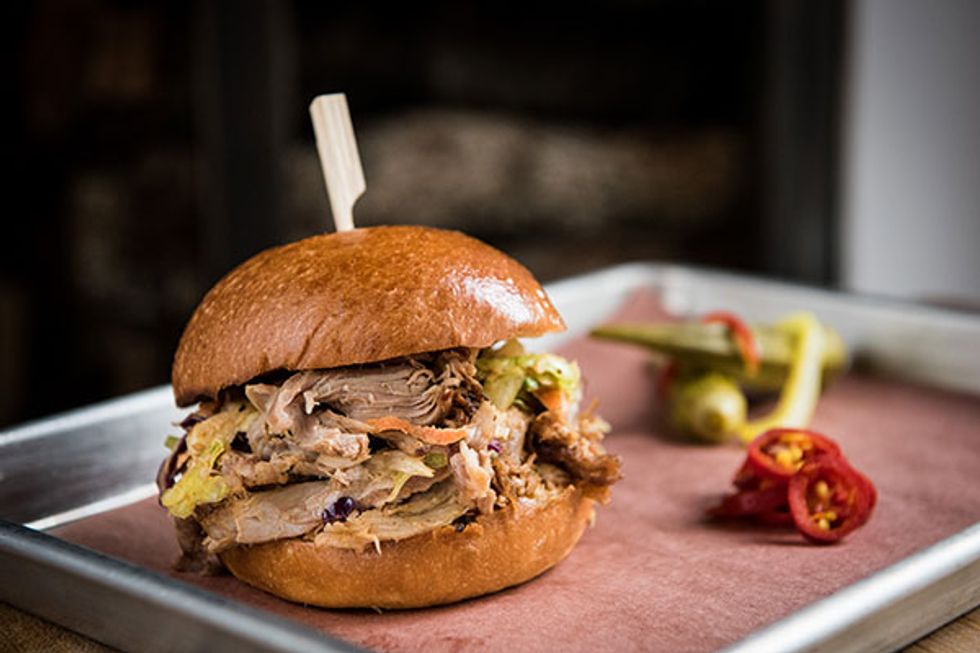 The family-feeling is amplified by a warm and casual dining room. The interior, designed by architect Zach De Vito, Rubber Design, and Northern Sun Contractors boasts concrete floors, simple exposed lighting, and custom metal shelving stacked high with wood piles to keep the smoker fed. The kitchen is semi-open, affording diners a view of the action, and on the walls are stenciled the words: "Every Butt Loves a Rub." We couldn't have said it better ourselves.