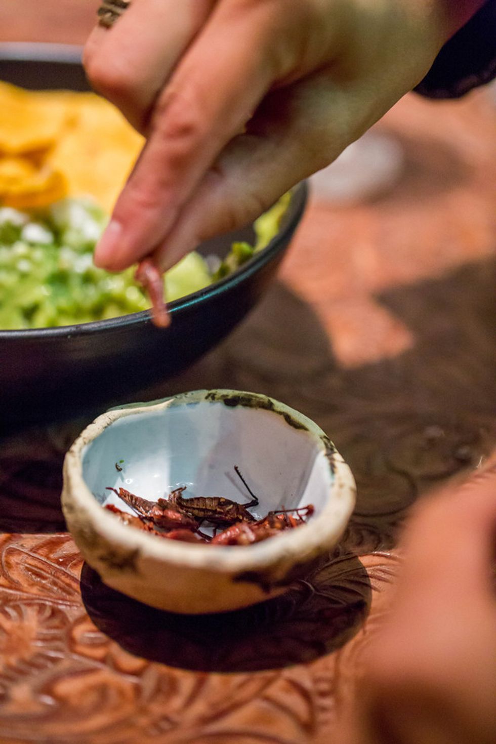 The Salt Air (left) is a must-order, a margarita dolloped with Oaxacan salt foam rather than the more-traditional salt rim. On the right, fresh chapulinas (grasshoppers) are served with guacamole and chips.