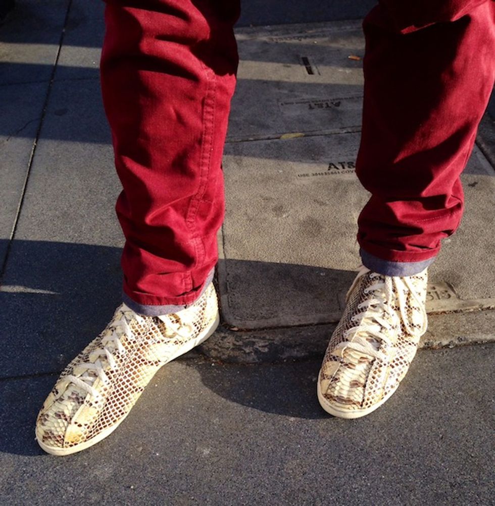 Browsing vintage stores is a form of meditation. Often it’s a bit buzzy and restless, flipping through the racks, unable to find anything that speaks to you. But sometimes, it’s a Kundalini experience when—KAPOW!—your shopping chakras align and the item that needs you is presented by the universe. Take these snakeskin sneakers, discovered by Nob Hill resident Joseph Murphey, who was proffered the groovy kicks by the vintage gods at Wasteland on Upper Haight. “I look to shop vintage when there isn’t anything particular I need. That way you aren’t just focused looking for one thing and you can look through everything. I feel you open yourself up to the best finds this way,” Murphey says. The sneaks are the fitting finish to his affordable chic look. Red chinos by Bedlow, a Hanes white vee, and an army surplus coat all combine for an effortless and urban style.
