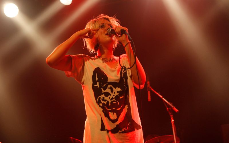 What makes “Past Life Martyred Saints” so intriguing is the immediate feeling that you’re hearing a neighbor’s band playing in a garage next door, with a drunken spoken-word vocalist inexplicably stealing the show. That would be Anderson, who haunts her tracks with lo-fi whispers and oddly sweet refrains about drug abuse, self-loathing, sexual repression, and a general, vague darkness that seems to inform her sense of mortality. But, as she commented after one song, “these are my expressions of joy, believe it or not.”