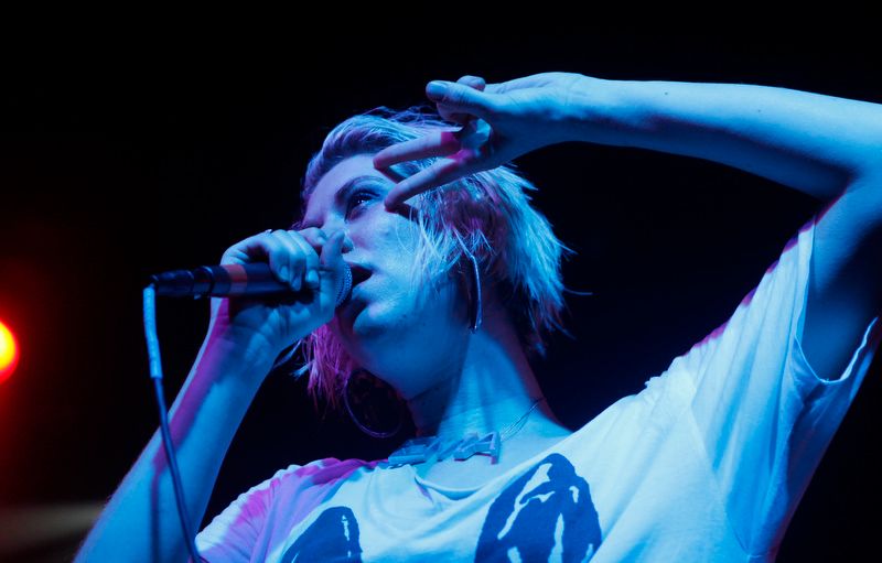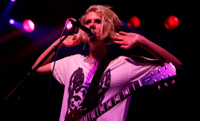 Anderson was more than happy to engage in moments of physical expressiveness. At one point, she contorted her body on the stage floor like an interpretive ballet dancer — a very Black Swan, if you will, or even if you won’t — pointing both legs up to the sky. And during the set closer “California,” she wrapped the microphone cord conspicuously around her neck, inviting questions about the possibly-suffocating nature of our supposedly golden state. As if that weren’t obvious by the opening lines of the song — “(Eff) you California / You made me boring...”