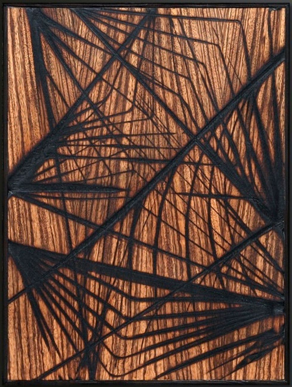 Ward's accomplished abstract style, which he brings to life in burning molten glass onto wood and in psychedelic glass drip sculptures that look like they belong in outer space, stand out alongside Slonem's own textured, conceptually detailed canvas works, which is no easy feat. The young artist's pieces take a violent, destructive process and turn it into a controlled chaos of angular burn marks and twisted glass figures.