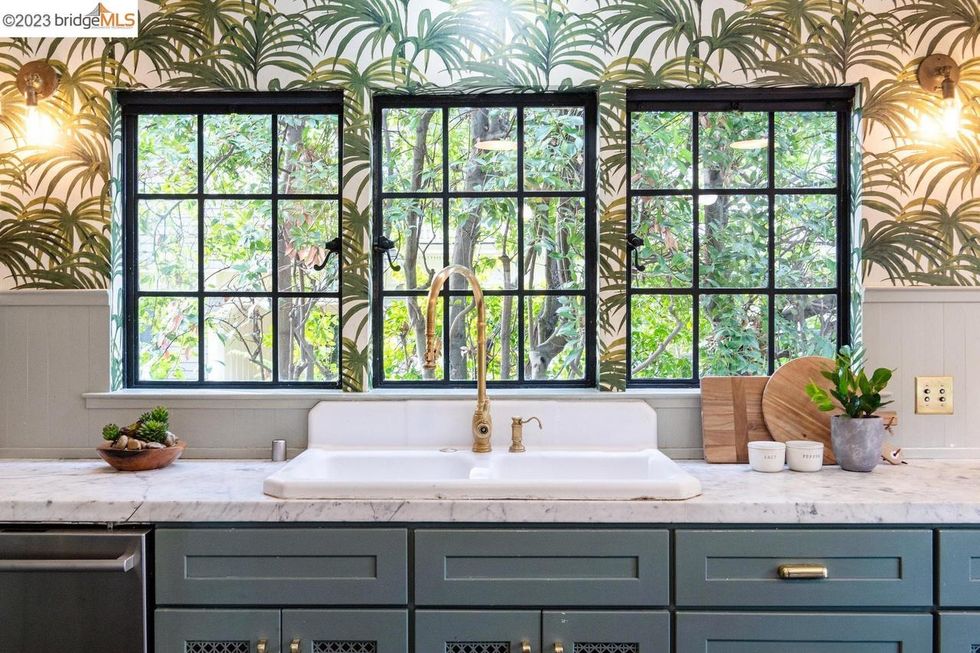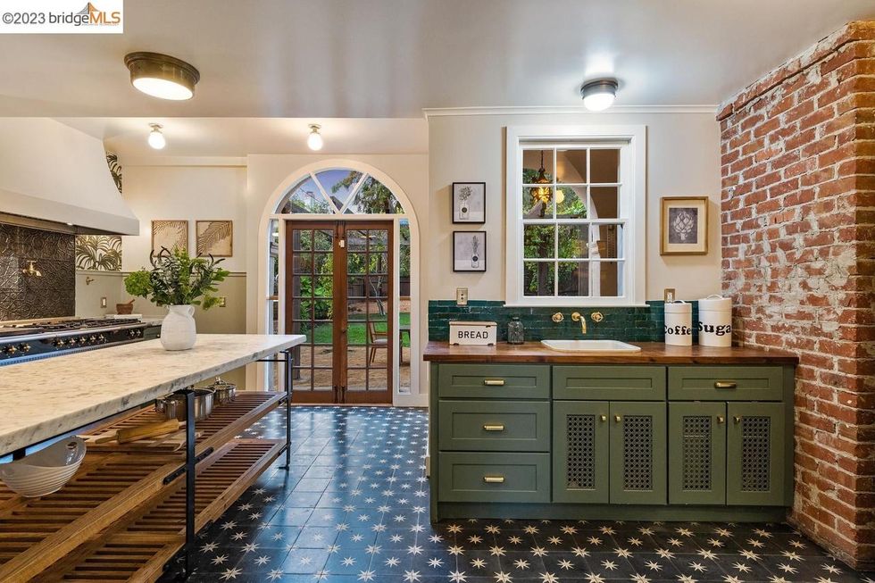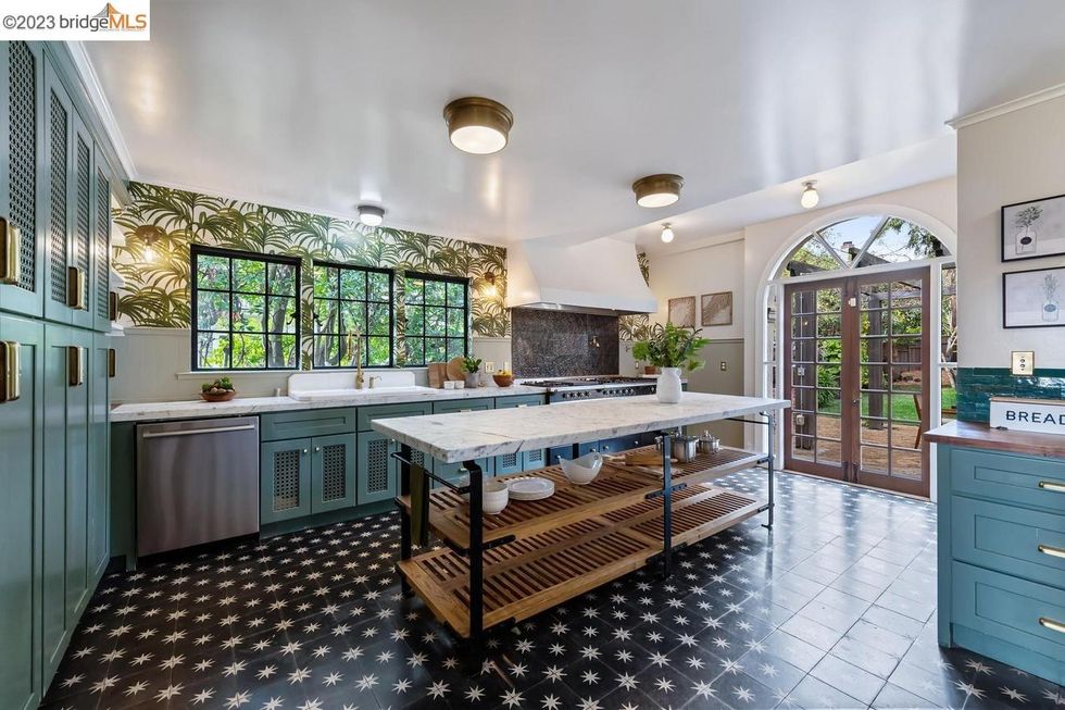 The cooking space is a sudden burst of contemporary style drawing the home's Mediterranean vibe. Cabinetry painted in robin's egg blue gets a lush accent of palm-print wallpaper. The floors are done in modern black-and-white tiles. Chefs will appreciate the antique nine-burner stove with three ovens and stove pot filler, the Viking fridge, and a central island. There is also a second sink tucked against a rustic brick wall. The kitchen opens through another arched doorway to the back patio for outdoor meals.
