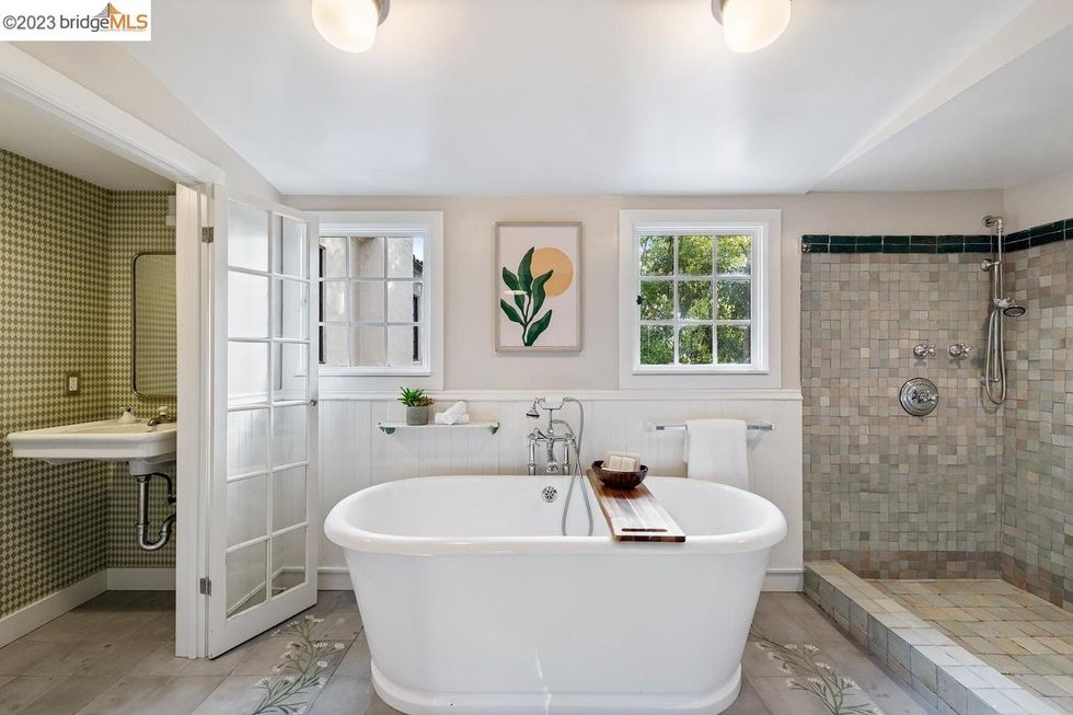 There are five bedrooms in all, all clean and classic with a few fun moments. In the master suite, the bed wall faces a clear view of a deep soaking tub in the bathroom, which also has a roomy open shower and separate wallpapered sink area. Many of the bedrooms have convenient built-ins, closet storage, and direct access to the outside.