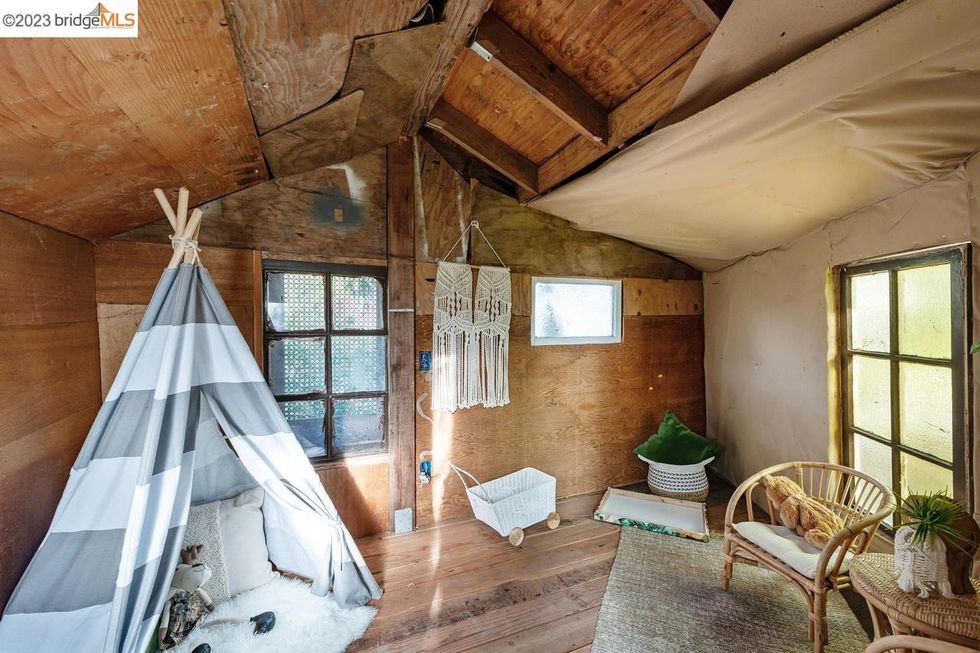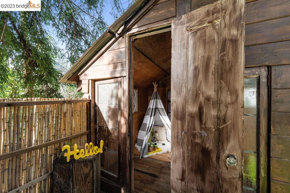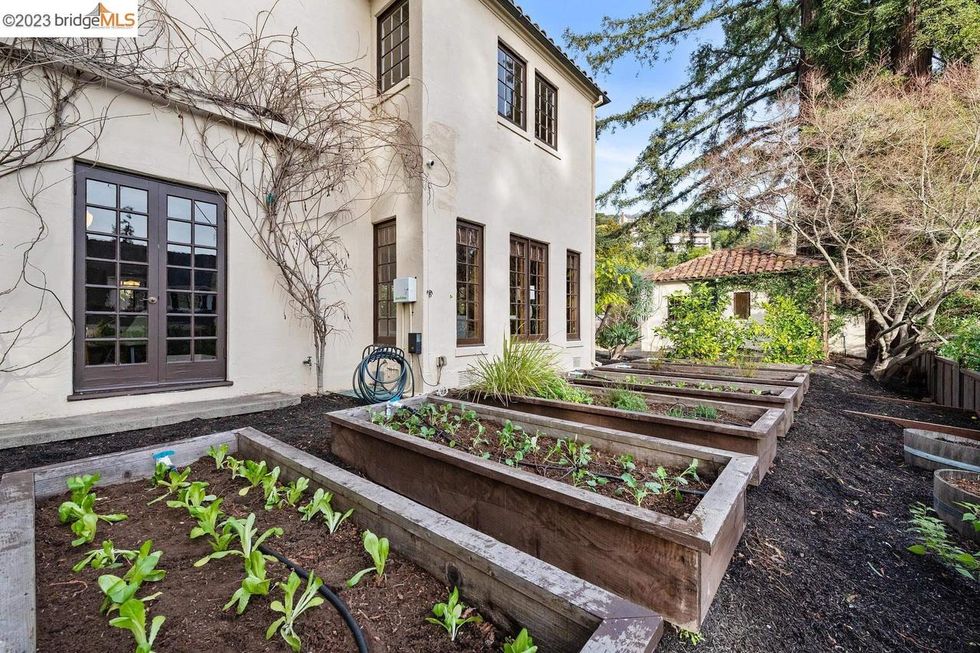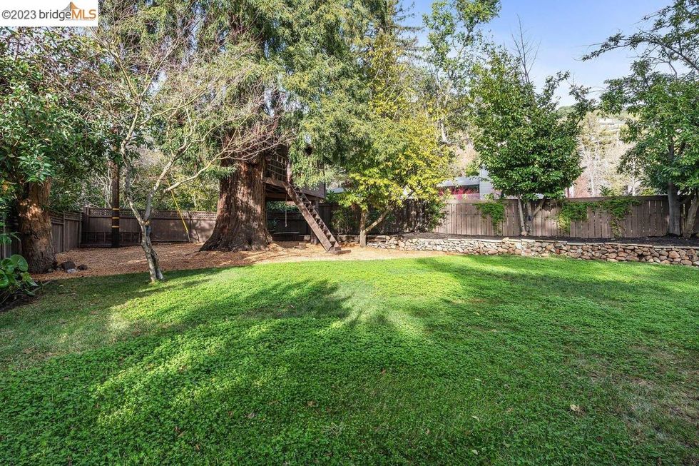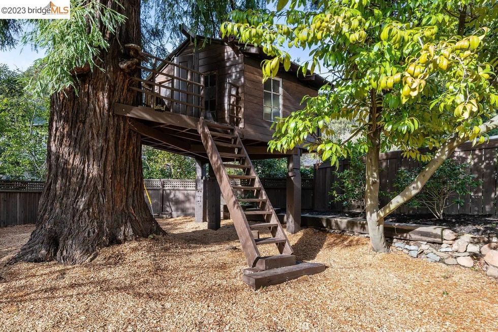The property is designed for maximizing time alfresco with raised herb and vegetable gardens, a grass lawn, mature redwood trees, and even a quaint treehouse.