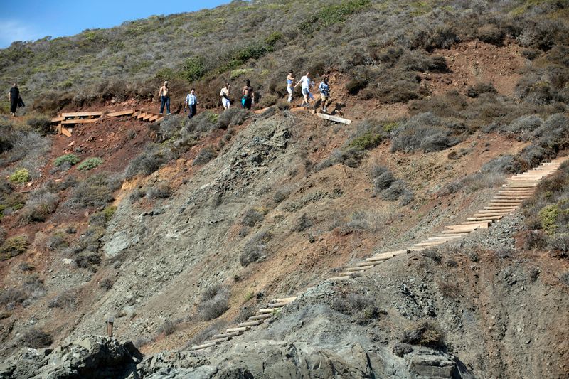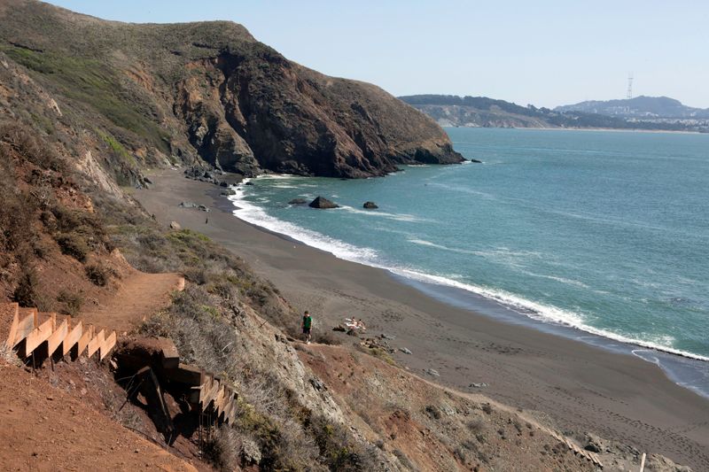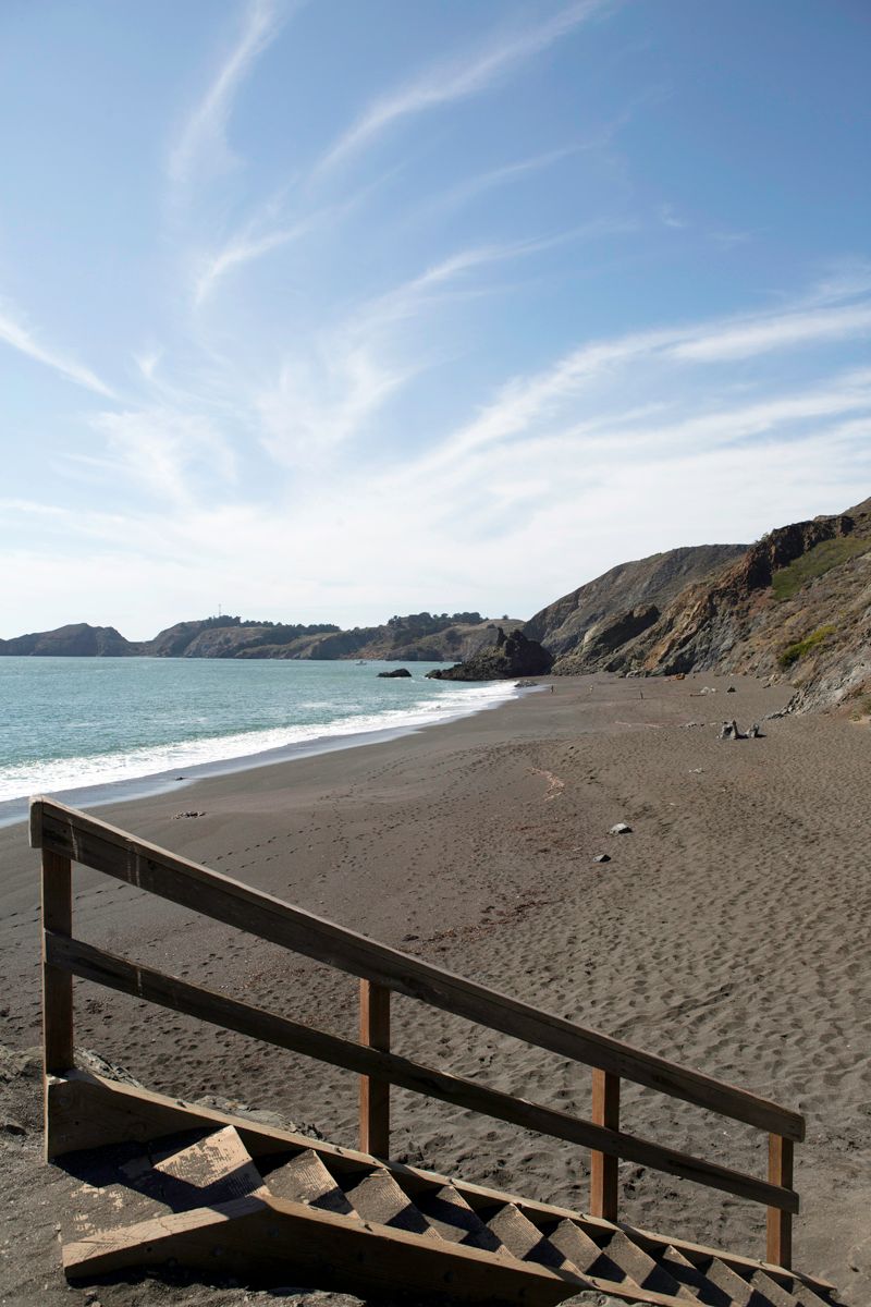 To get there, head to Hawk Hill in the headlands and then keep going past the long steep one-way hill. As it flattens out, turn left at the "Upper Fisherman" turnout with a bathroom. A very long staircase drops you down the beach. Parking is limited.