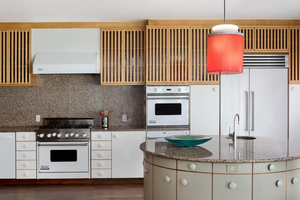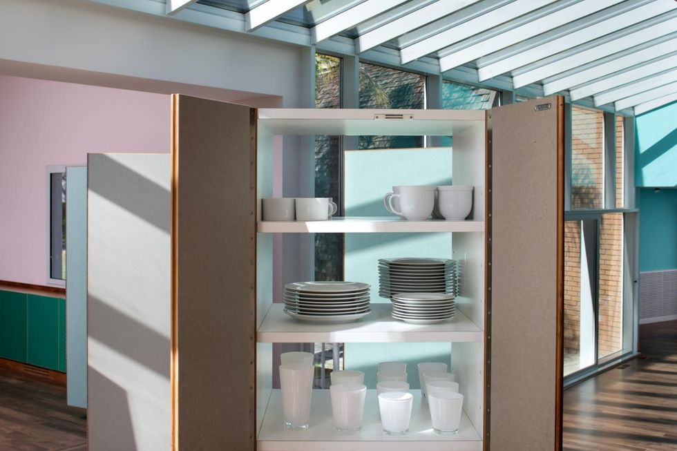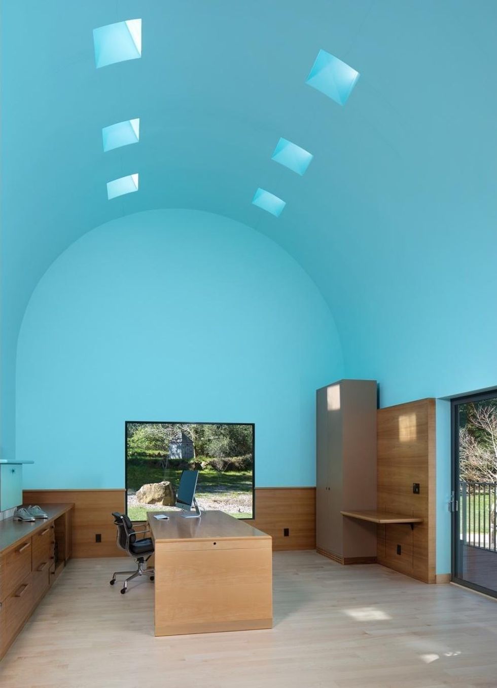 Created around the concept of a mini village, the property has five pavilions—each designed with its own shape, material, and attitude—arranged like children's blocks around a central glass atrium. A wood-sided barrel of a building acts as an office; and the living room, dining room, and kitchen are all separated not by walls but by a forest of freestanding cabinets, rendered in an airy hue, that double as storage for your dishes and art objets.