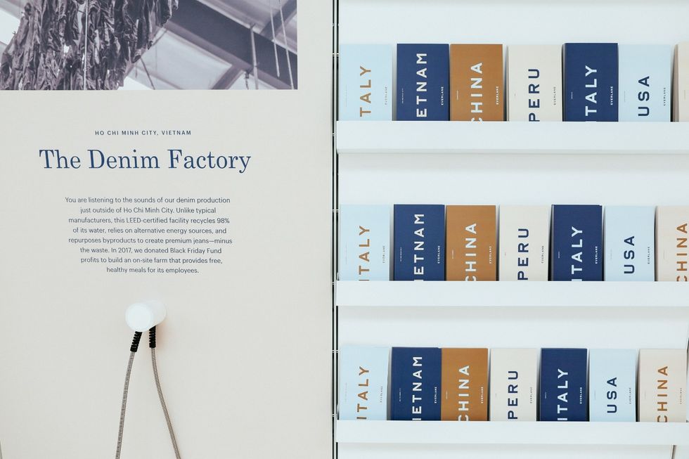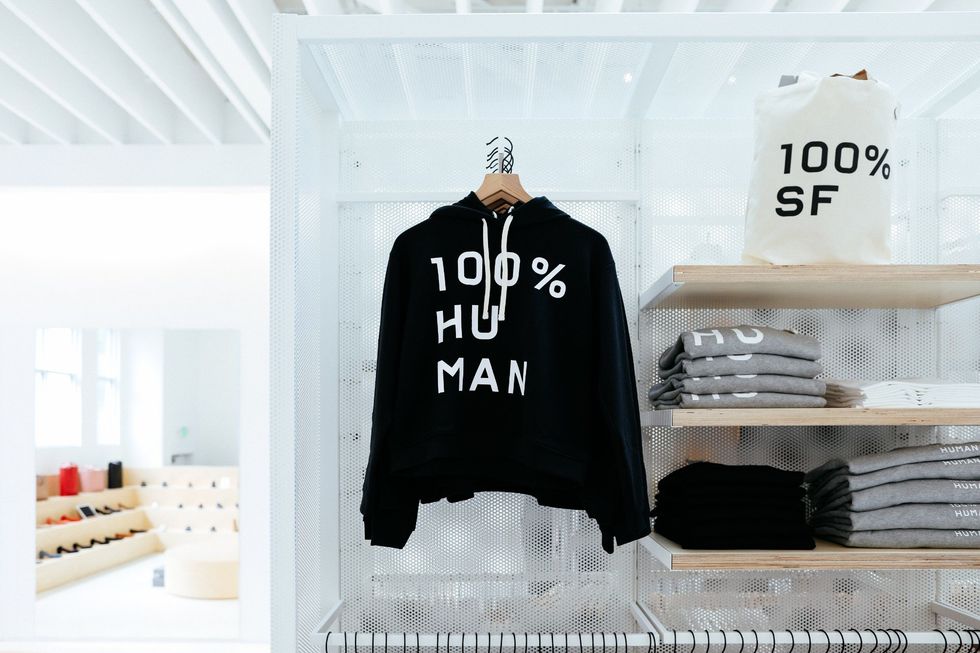 In line with the mission to be radically transparent, the store also provides information on each of their factories in unique sound booths: Pick up the receiver to learn about where their denim and tees are made. Another section is dedicated to community-focused campaigns including 100% Human, which donates to the American Civil Liberties Union (ACLU); and the just-launched 100% SF kit, which gives back to Dolores Street Community Services, helping low income and immigrant communities in the Mission. (They're planning on donating $20,000 to start). On our visit, staffers were wheeling around a Radio Flyer wagon filled with pies for people in the community.