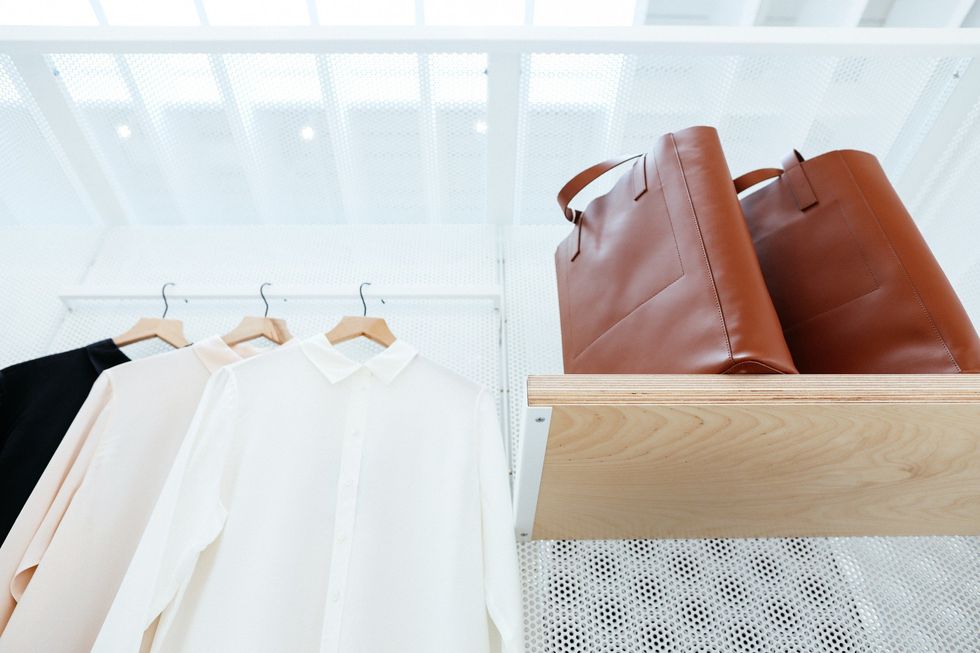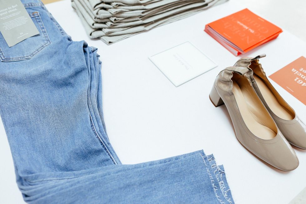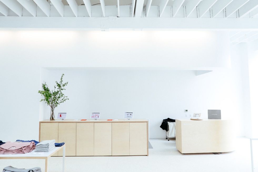 The space is as you'd probably expect: minimalist and pleasant, with the Everlane aesthetic is apparent in thoughtful design elements like tiered geometric shelving, fair wood countertops, and sunshine pouring through lovely round skylights in every fitting room.