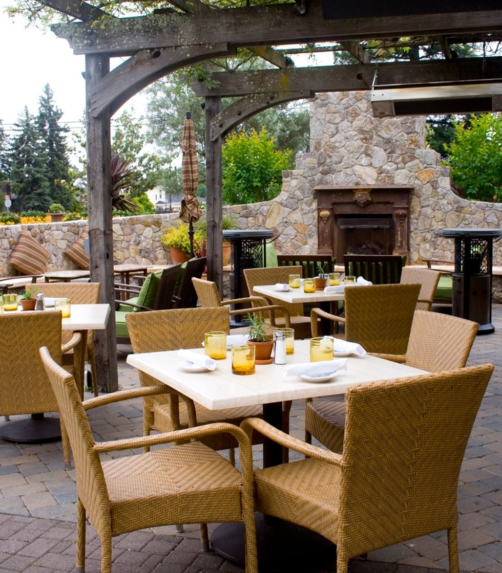 Inside ESTATE are several warm, romantic rooms highlighted by the dramatic artwork of Christopher Butler’s interpretation of old Italian films. Sondra describes the connection between the food and the art: "My inspiration is not limited to beautiful raw ingredients, perfect flavors, celebration and laughter. I am also inspired by the imagination and creativity of artists, poets and musicians everywhere. I find myself mesmerized by the early works of eccentric Italian filmmakers. These films capture and recreate a mood of reverie, mystery, intensity and often an avant-garde sense of place which I wanted to conjure up at ESTATE.” The transporting sense of place continues outside to the expansive patios complete with a stone fireplace and a climbing rose over 100 years old entwined in a gazebo shading the tables.