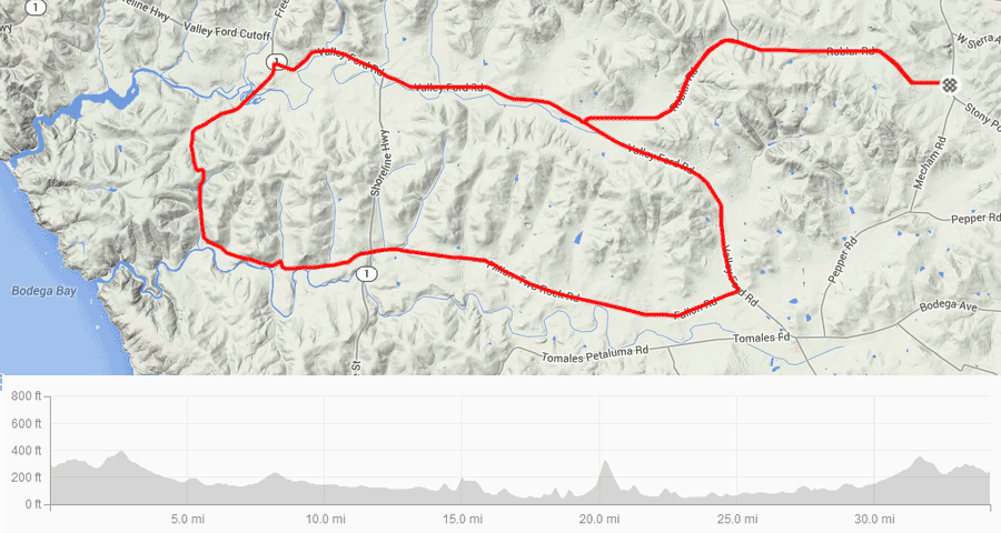 At the mid-ride point on the first cross of Highway 1, go left down the Highway to Tomales—there's a killer bakery there, very popular with cyclists. You can rejoin the route by going west on Dillon Beach rd, (across from the bakery) then turn right after a mile or so on Middle Rd. to join the Whitaker Bluff Rd.
