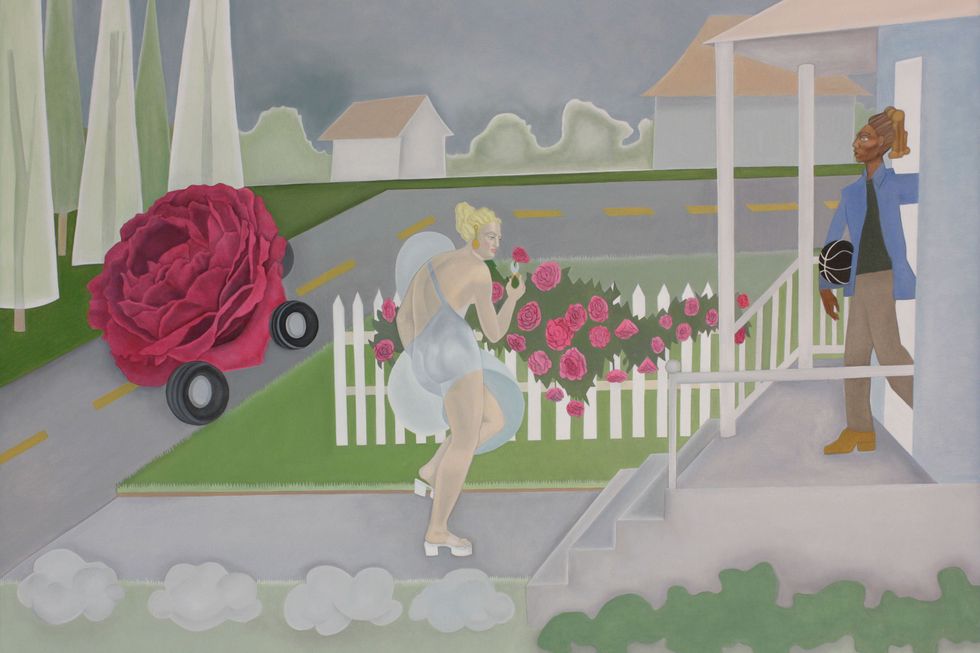 Elizabeth Fox’s collection of narrative paintings playfully blend pop culture and art history in bright, floral imagination. Influenced by sex icons of the 1950s and '60s coupled with contemporary drag and queer culture, The Trouble with Flowers centers on characters amalgamated from multiple influences who experience a full spectrum of life’s joys and sorrows.