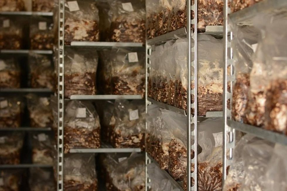 In a dark room lined with metal shelves on the Monterey Bay, droplets of water fall from the ceiling, pooling in shallow puddles on the concrete floor. On them sit hundreds of blocks—neat rectangles of sawdust and spores from which mushrooms pop like silent firecrackers.