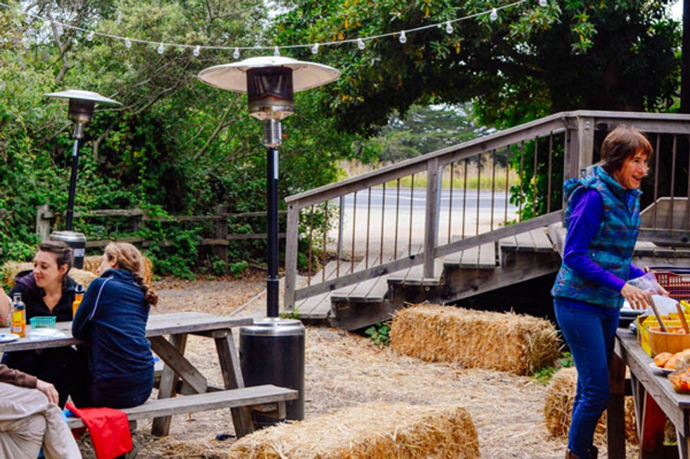 At five o'clock sharp, with the fresh breeze from the ocean, Pie Ranch lovers start to arrive bearing casseroles, salads, cakes, pies, grilled veggies, strawberry crates, and other delicacies to be shared at the potluck table.