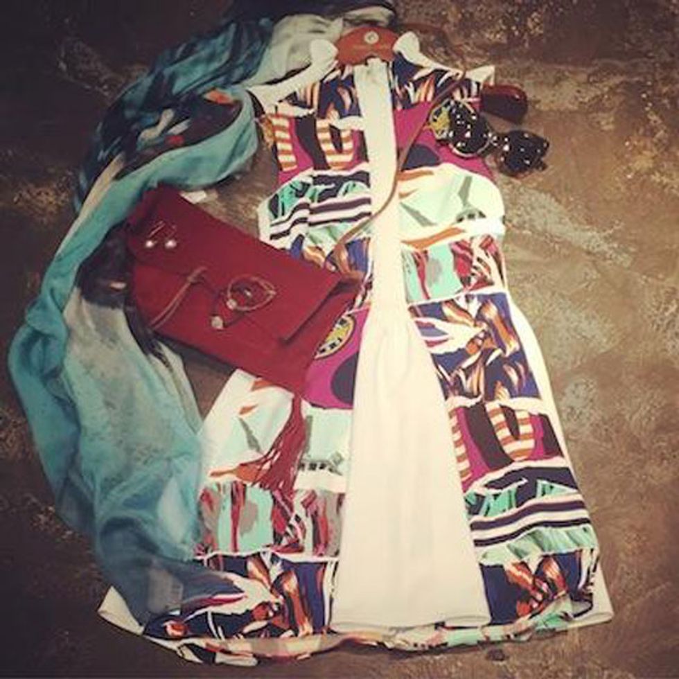 // Kenzo dress ($755); Yigal Azrouel scarf ($385); Designs by Alina pearl earrings ($400) and leather-and-diamond bracelets ($450-$650); Giada Forte clutch ($286); and Illesteva sunglasses ($290); all at Elizabeth Charles (Lower Pac Heights), elizabeth-charles.com.