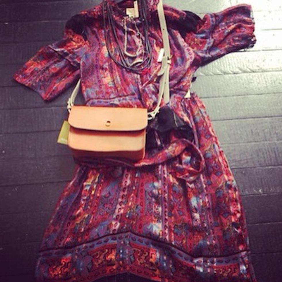 // Vintage silk skirt and top ($195); Mimi London leather box bag ($395); African sequin disc necklaces ($28 each); and silvertone arc necklaces ($45 each); all available at Eden & Eden (Jackson Square), edenandeden.com